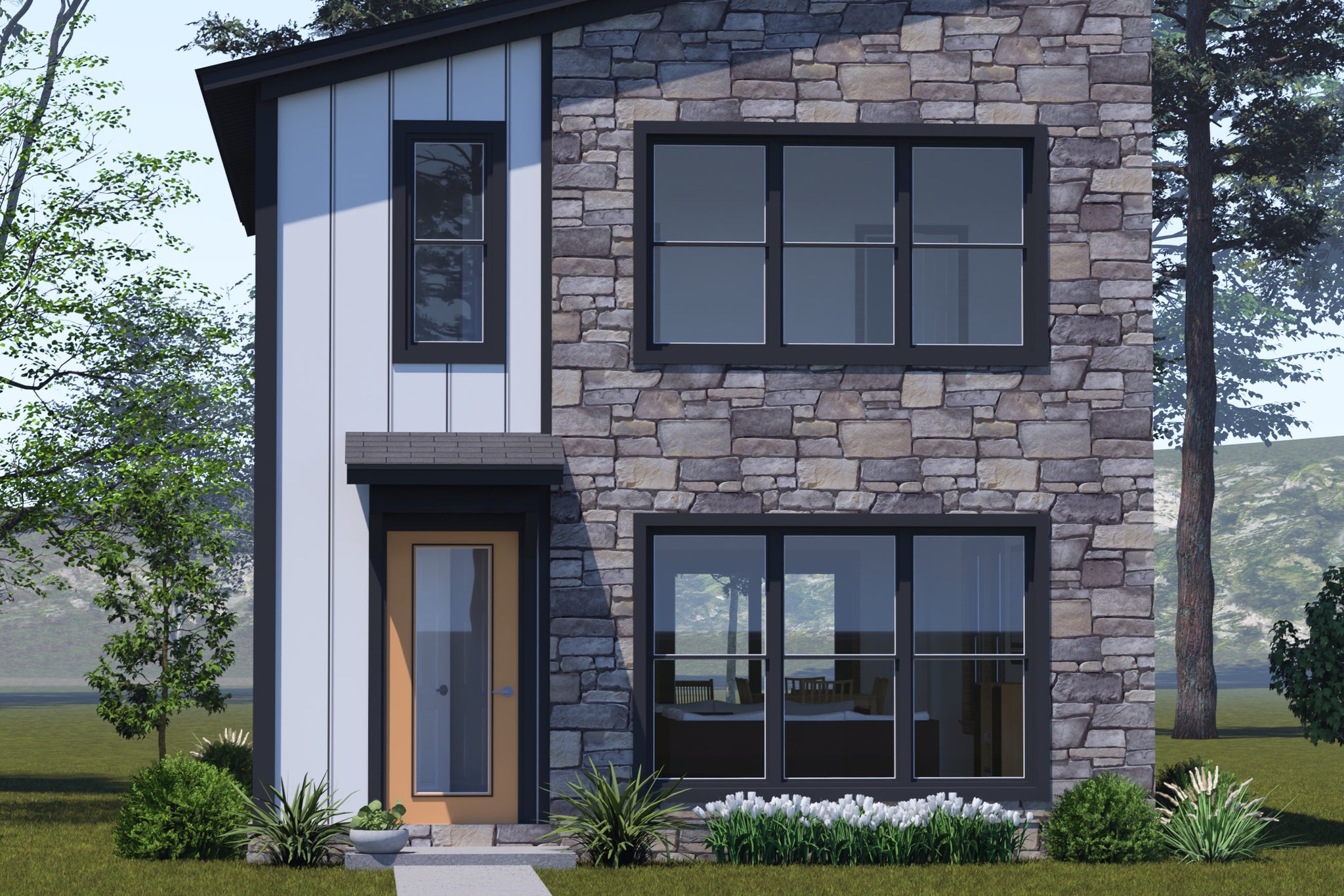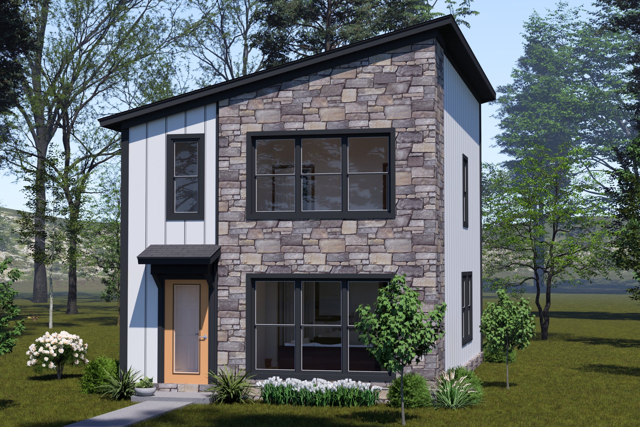 This 1280 sq ft modern contemporary two-story home combines sleek design with practical living, perfect for today’s modern lifestyle. The main floor showcases an airy open-concept layout that connects the keeping/family room, dining area, and kitchen, making it ideal for entertaining or relaxing. The kitchen features an eating bar, breakfast area, and wall pantry, offering both style and functionality. Large windows and vaulted ceilings enhance the sense of space and light throughout the home.