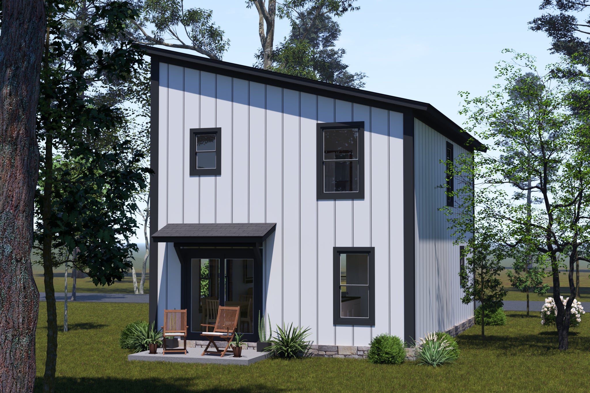 Upstairs, the second-floor master suite serves as a private retreat complete with a walk-in closet, private bath, and convenient second-floor laundry. Two additional clustered bedrooms share a full bath, making it perfect for families or guests. Built on a slab foundation with stick and truss roof framing and a 3:12 roof pitch, this design blends minimalist architecture with everyday comfort. Compact yet sophisticated, it’s ideal for urban lots or homeowners seeking a modern, efficient space that doesn’t sacrifice style.