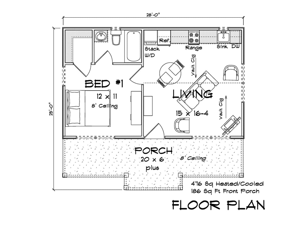 This 476 sq ft cottage-style home offers simple elegance and efficient design, ideal for a guest house, vacation retreat, or minimalist living. The inviting covered front porch (186 sq ft) welcomes you into a bright and open living space that seamlessly connects the keeping/family room, kitchen, and breakfast area.