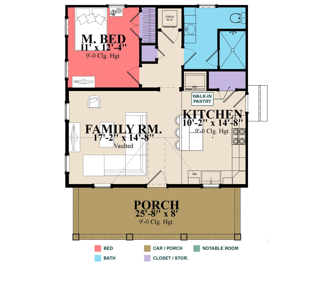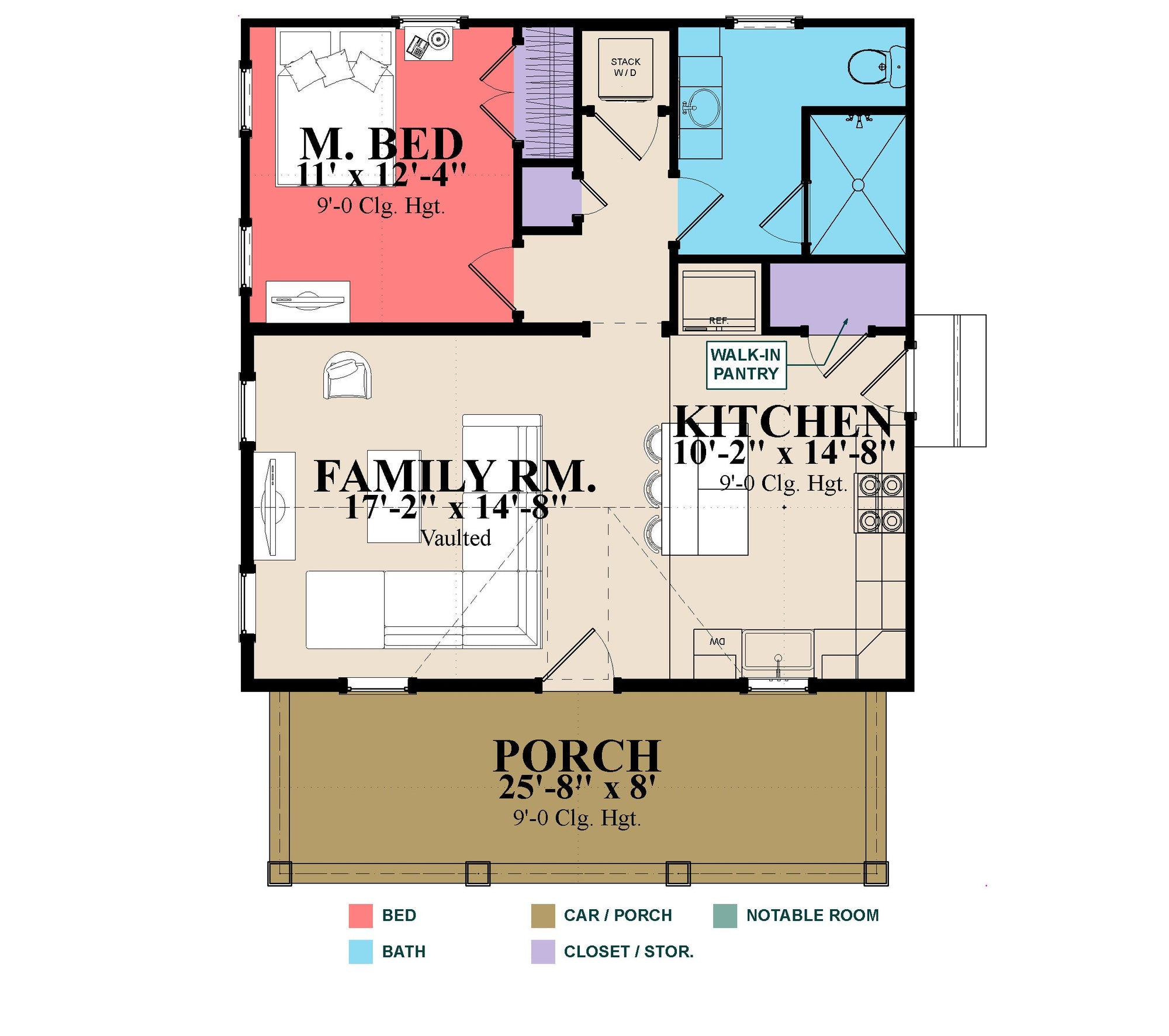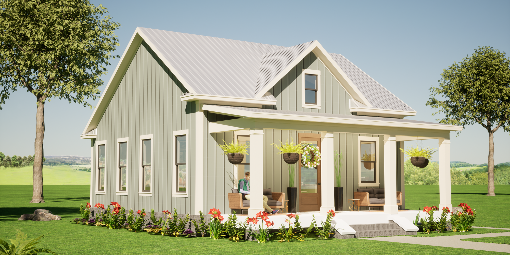 This cozy and efficient 938 sq. ft. cottage-style home is full of charm and smart design, ideal for a guest house, vacation retreat, or minimalist living. Featuring 1 bedroom, 1 bathroom, and a welcoming board and batten exterior, this plan offers warm curb appeal with a covered front porch and striking two-story grand room inside.