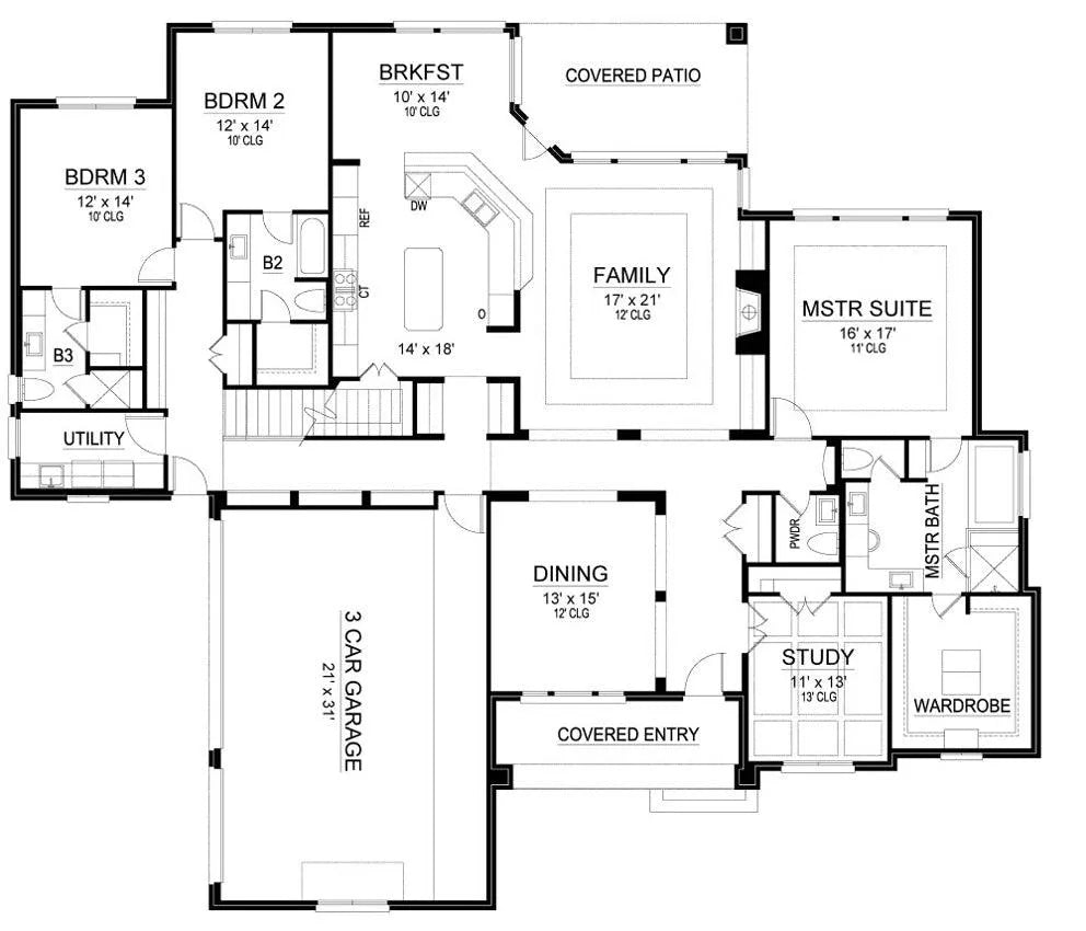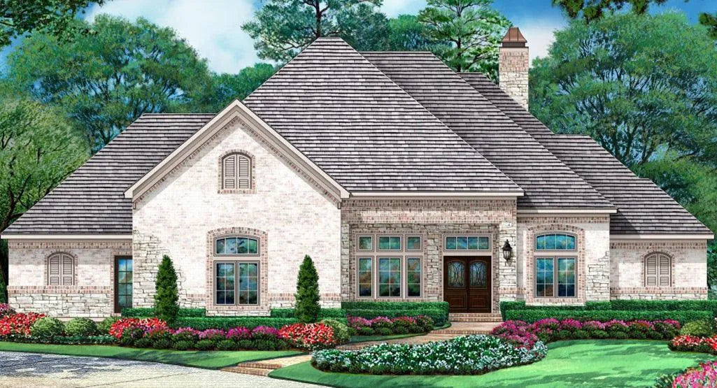 This spacious home features a total living area of 3,773 sq ft, with 3,195 sq ft on the first floor and an additional 587 sq ft on the second floor. The design includes three well-appointed bedrooms, three full bathrooms, and one half bathroom, making it ideal for families. A side-loaded garage offers 718 sq ft of space with three bays for your convenience. Built on a sturdy slab foundation, the house features 2x4 wall framing and stick roof framing, with a building height of 35' and elegant trey ceilings ranging from 11' to 12'. This home combines comfort and functionality in a stylish layout.