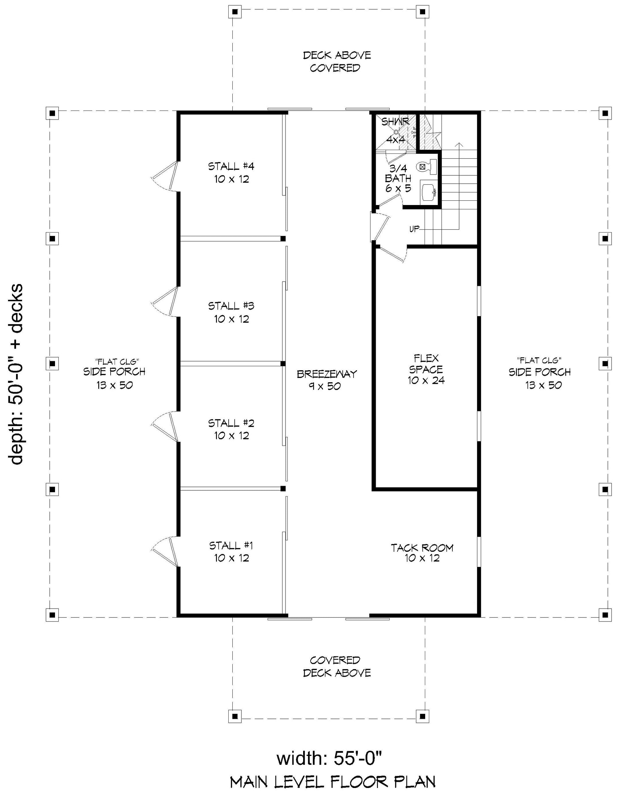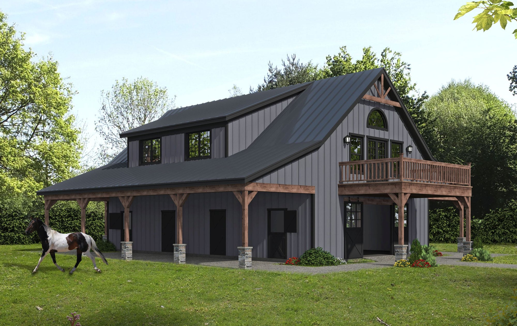 This 1,846 sq ft home features a unique blend of living and functional spaces. The first floor includes a 404 sq ft layout with a workshop, 4-stall breezeway, tack room, and flexible space, offering plenty of room for various activities. A large side porch on the first floor provides additional outdoor living space, perfect for relaxing or entertaining. The second floor is a spacious 1,442 sq ft, centered around a master suite with a walk-in closet and vaulted ceilings. The home also features covered front and back porches, a large deck, and a walk-in pantry for extra convenience in the kitchen.