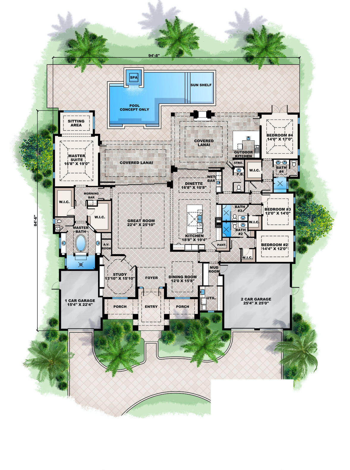 This stunning home spans 4,599 sq ft of heated living space, featuring a well-designed slab foundation and a luxurious layout for both function and style. The first floor offers a spacious, open-plan living area that includes a formal dining room, breakfast area, and a home office/study. The master suite is located on the main floor, complete with a master sitting area for ultimate relaxation, offering both privacy and convenience. Adjacent to the master suite, the butler's pantry and wet bar provide easy access for entertaining.