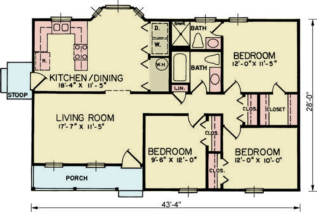 The exterior pairs classic bungalow charm with practical details like a covered front porch and side stoop, creating inviting entry points and curb appeal. With an efficient footprint of 47'-4" wide by 30' deep, this home is ideal for narrow lots while still providing spacious indoor living. Whether you’re seeking a comfortable starter home or a cozy forever space, this well-balanced design delivers both comfort and character.