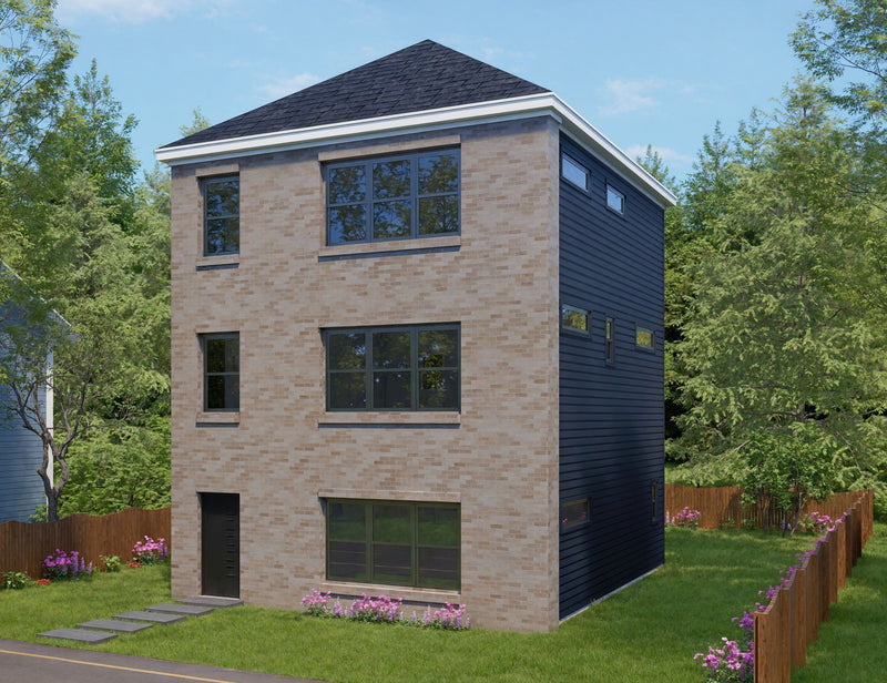 The second floor includes two well-sized bedrooms connected by a Jack and Jill bathroom, along with a laundry room for added practicality. The third-floor master suite provides unmatched privacy, complete with a spacious walk-in closet and a luxurious double-vanity bathroom. Another versatile bedroom on this level allows flexibility for guests, office use, or additional family needs. With 9-foot ceilings on every level, this contemporary plan combines vertical living with modern style and exceptional efficiency.