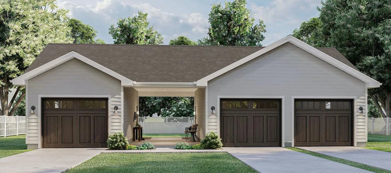 This well-designed garage plan encompasses 851 square feet, featuring three bays for optimal storage and vehicle accommodation. With a front-load design, accessing your vehicles and equipment is effortless. The garage's sturdy slab foundation and 2x4 wall framing ensure durability, while the 6:12 roof pitch adds a stylish touch.