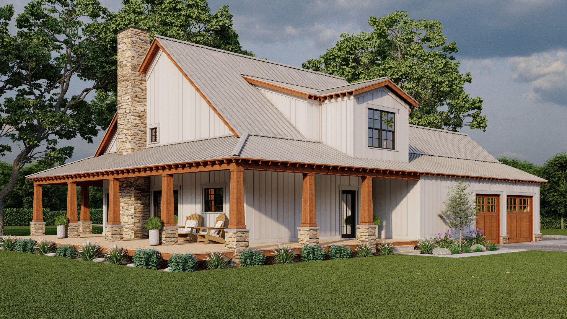 Upstairs, two additional bedrooms share a full bath and overlook the grand room below, adding openness and character to the design. A wraparound porch extends the living space outdoors, perfect for relaxing evenings or morning coffee. The rear-load 2-car garage keeps curb appeal clean, while the slab or crawl foundation and efficient 2x4 framing keep construction practical. With a blend of open living, private spaces, and farmhouse flair, this home is ideal for families seeking style and function.
