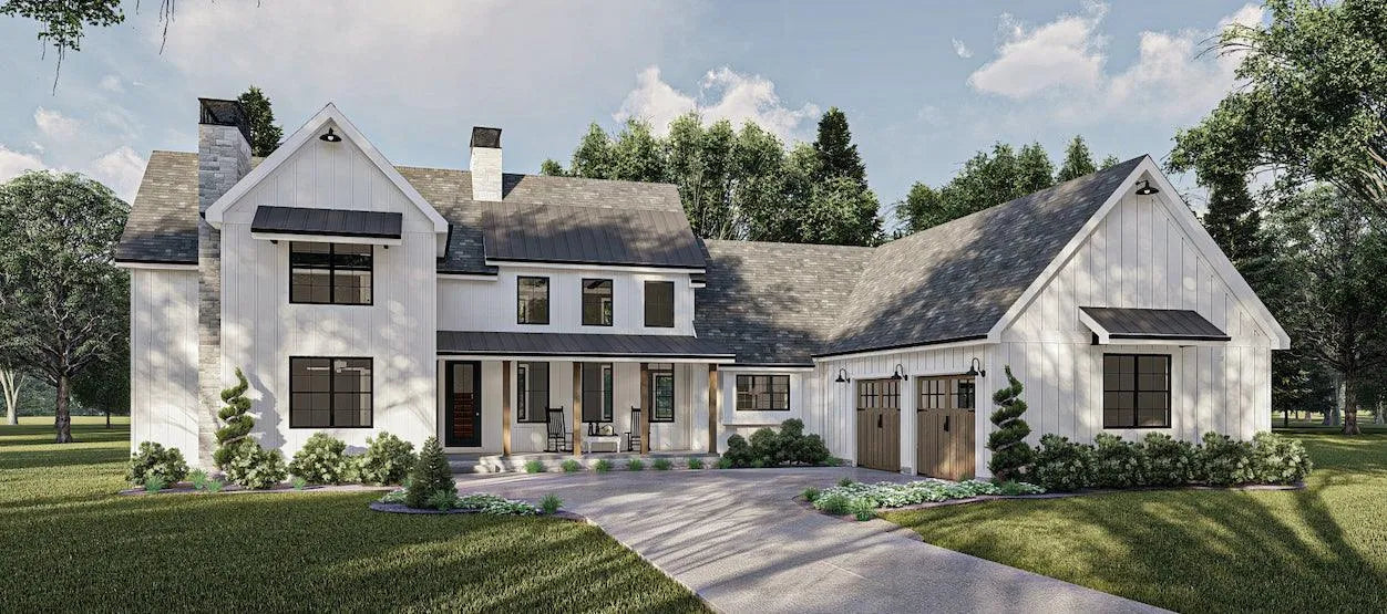 This L-shaped, 1.5 Story, Modern Farmhouseplan is highlighted on the exterior by dual fireplaces, metal roofs, front and back porches and board and batten siding. Inside, immediate impressions are made by a soaring 2-story-high, wood-beamed cathedral ceiling in the great room. A trio of tall windows tucked beneath shed roofs complement both the front and rear walls of the great room, offering views through the front porch and rear patio. The kitchen, with expansive work island, lies beneath its own beamed ceiling and is open to the dining area.