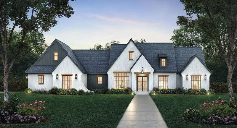 This impressive home offers a total living area of 2674 sq ft, all on the first floor. It features four bedrooms, two full bathrooms, and one half bathroom, making it ideal for families. The design includes a generous total porch area of 692 sq ft, perfect for outdoor gatherings. A side-loading garage provides 1037 sq ft of space for up to three vehicles, enhancing convenience and functionality. Built on a slab foundation with 2x4 wall framing, the home is complemented by a stick roof framing and elegant brick exterior siding. Its dimensions of 90 feet 5 inches in width and 71 feet 7 inches in depth contribute to a spacious layout. The building height reaches 27 feet 4.5 inches, with a ceiling height of 10 feet on both the first floor and in the garage. This home seamlessly blends comfort with modern design.
