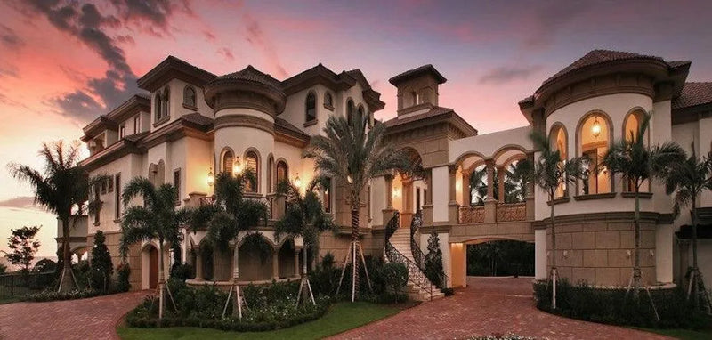 This breathtaking Mediterranean luxury house plan was chosen by Ocean Magazine as one of the “25 Top Ocean Front Homes in the U.S.” Thedream home plan at just under 8,500 square feet of living space and a total area of over 20,000 square feet includes an open breezeway connecting the main and guest homes. The unique bridge is centered over a large arched drive-through that enters into the expansive motor court serving multiple garages.