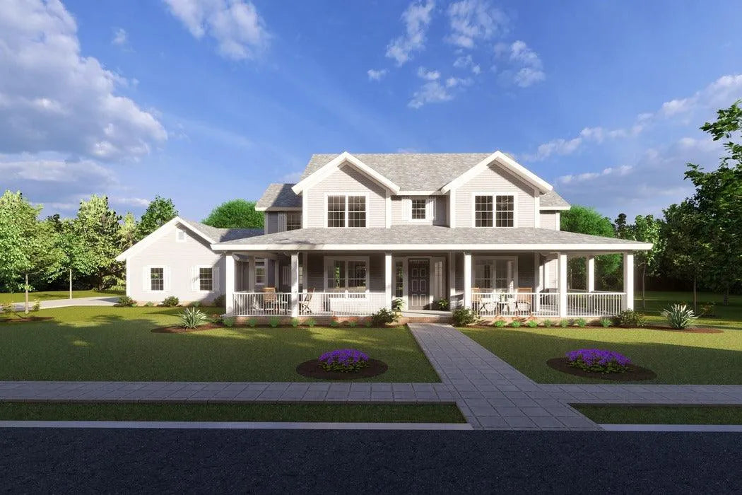 Discover this stunning 4-bedroom residence featuring a generous total living area of 3,266 sq ft. The first floor encompasses 2,176 sq ft, offering an open and inviting layout perfect for modern living. With an additional 1,090 sq ft on the second floor, there's ample space for family and guests. Enjoy outdoor entertaining on the impressive front porch, measuring 647 sq ft, or relax on the rear porch, which adds an additional 246 sq ft of outdoor living space—totaling 893 sq ft of porches. The 660 sq ft garage accommodates three vehicles, providing convenience without sacrificing style. Built on a sturdy slab foundation, this home features 2x6 wall framing for enhanced durability. With a width of 84' and a depth of 59', the home's design balances spaciousness and functionality. The building height of 29' complements the overall aesthetic, making this property an ideal choice for those seeking both comfort and elegance.