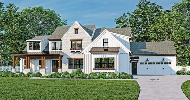 Windsor Park is a modern farmhouse design that is true to the form with crisp white siding and painted brick. Metal roofing, timber columns and metal roofing are also correct materials of choice for the style. There is garage space for four vehicles or big toys which is sure to please an active family. The main level is open and filled with natural light. The kitchen is the hub of the main floor and will be the favorite gathering space for family and friends. The master suite is located on this level and is glamorous and features a "wet room" -soaking tub and large shower in one space. There is a covered porch off the master suite so the owners can enjoy the outdoors. A guest suite or home work space is perfectly situated for privacy and function. The covered rear porch has a grilling station and lots of room for outdoor furniture. The upper floor has three additional bedrooms each with a bath and large closet. A loft adds living space for a teen lounge or study area. The optional bonus room has many uses from simple storage to recreation - you decide.
