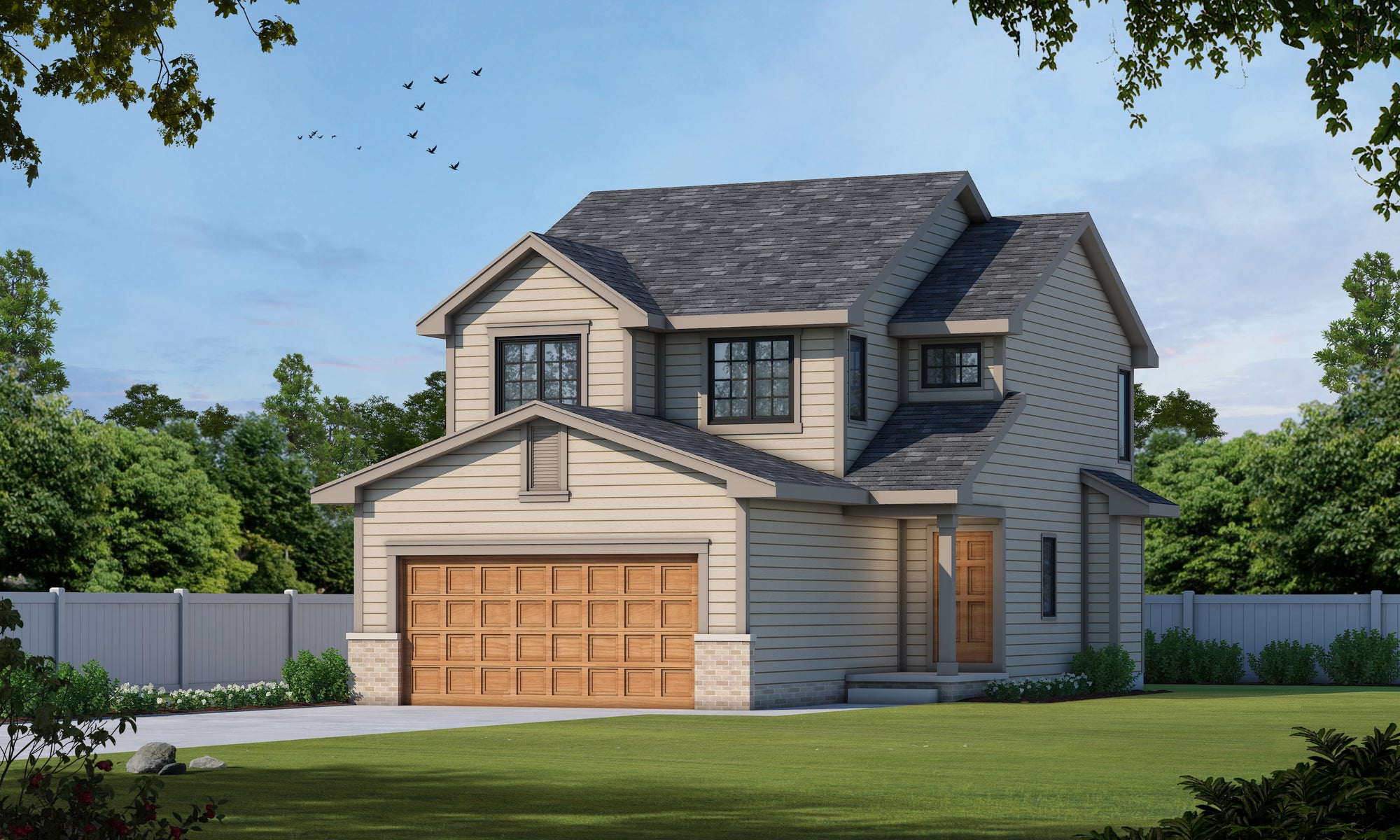 Upstairs, the 768 sq ft second level includes a spacious master suite with a private bath, alongside two additional bedrooms and a full bathroom. A 448 sq ft front-load garage ensures ample space for vehicles and storage, while the unfinished basement offers future expansion possibilities. With 9' ceilings on the main level, a covered front porch for outdoor relaxation, and a 6:12 roof pitch, this home combines cozy aesthetics with modern functionality.