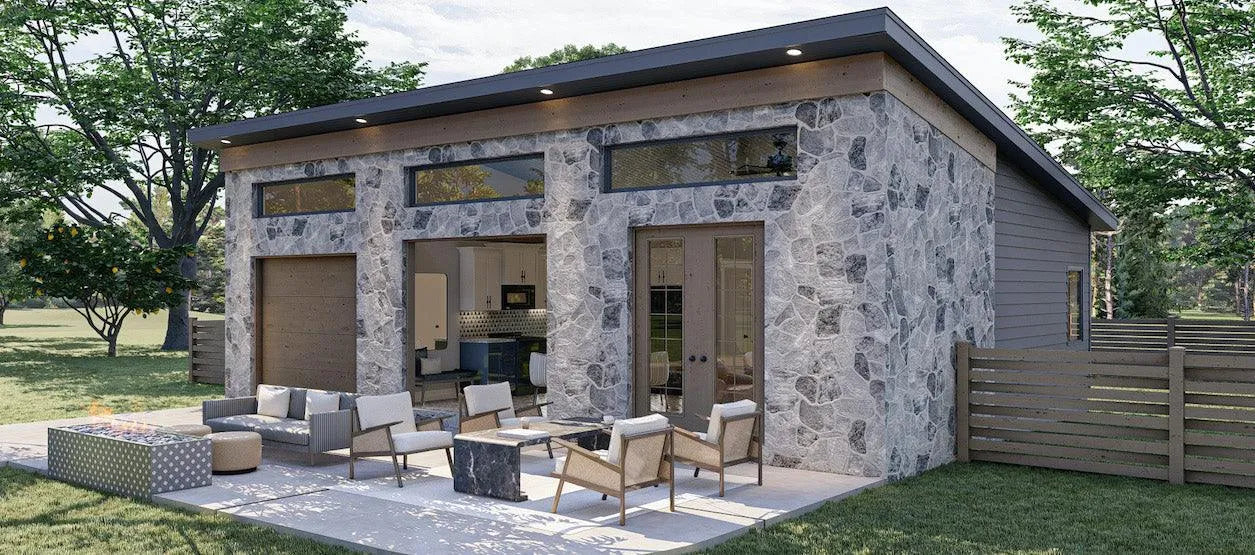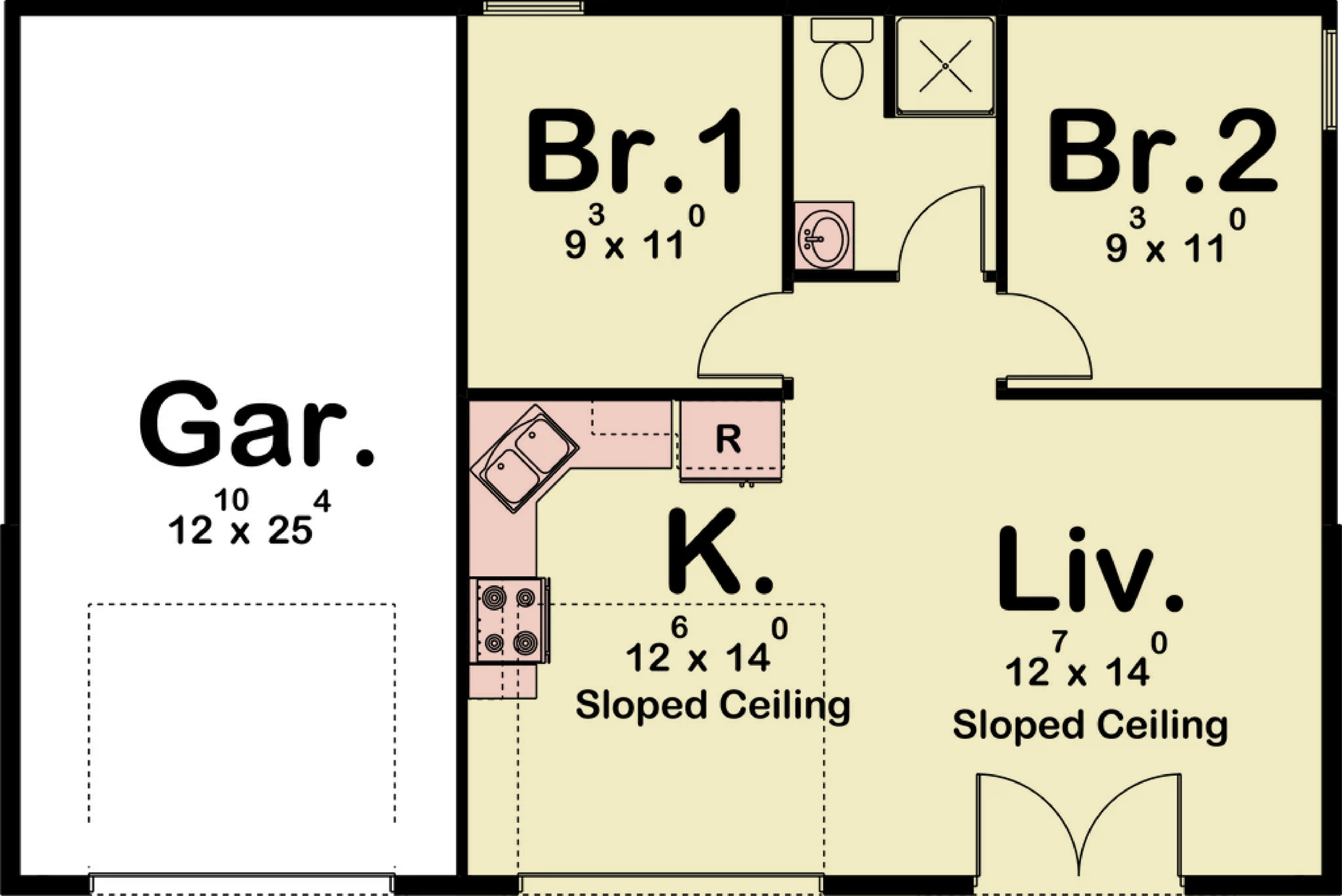A compact yet functional home that features a total living area of 672 sq ft, all on the first floor for easy accessibility. Ideal for small families or couples, it includes two cozy bedrooms and a well-appointed bathroom. The garage, measuring 342 sq ft, provides convenient front access and accommodates one vehicle. Built on a solid slab foundation with 2x6 wall framing, this home is designed for durability and efficiency. The truss roof framing adds structural integrity while allowing for an open interior. With a width of 39 feet and a depth of 26 feet, this design maximizes space in a compact footprint, making it perfect for modern living.