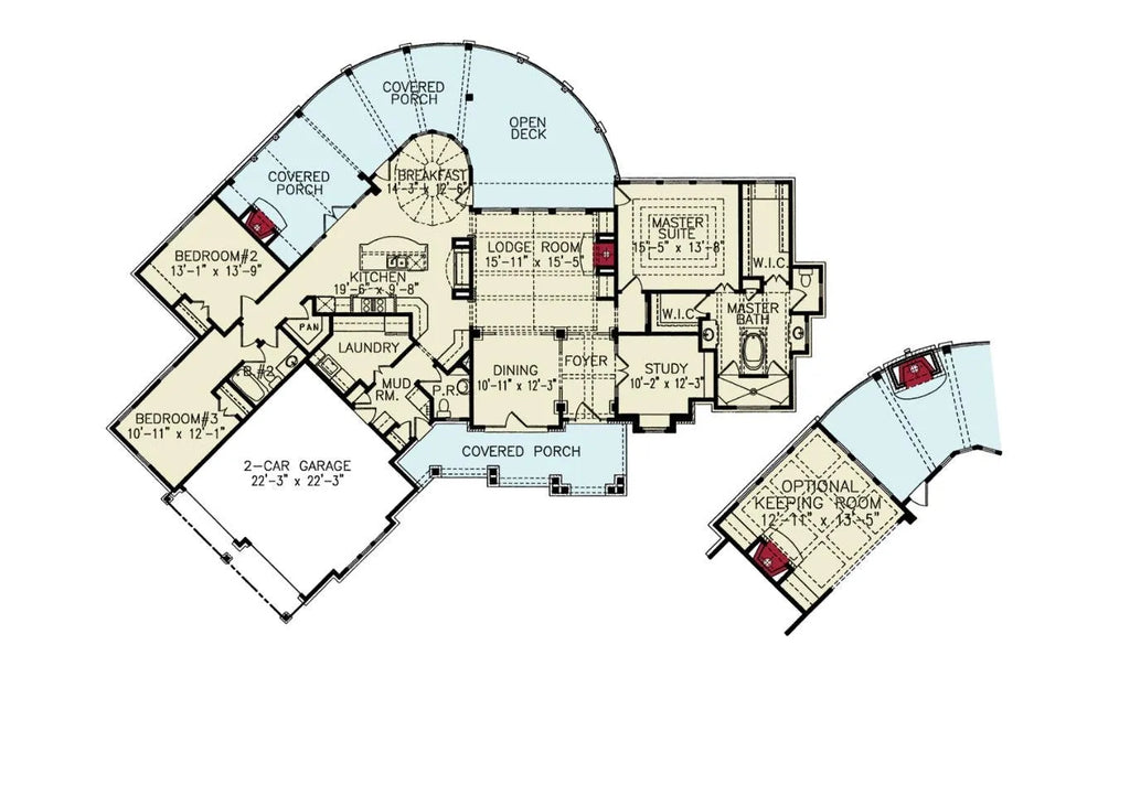 The smallest of the Tranquility collection, this rustic house plan is perfect for the empty nesters or smaller family. This ranch floor plan boasts open spaces and outdoor living for a tranquil lifestyle. The timber trusses in the foyer and lodge room are the perfect example for how this cottage house plan brings nature indoors. The spacious vaulted lodge room features a wall of windows to allow an abundant amount of natural light. The large kitchen includes a bar area perfect for entertaining and opens to the rounded breakfast area. The master suite highlights a trey ceiling, large walk-in closet, and master bath with walk through shower. This mountain home plan allows for outdoor living at its finest. Featured on this plan is a covered porch with fireplace and rounded covered/open deck expanding the rear of this home plan. Two additional bedrooms round out this main floor. An option for a keeping room is included in the plans.
