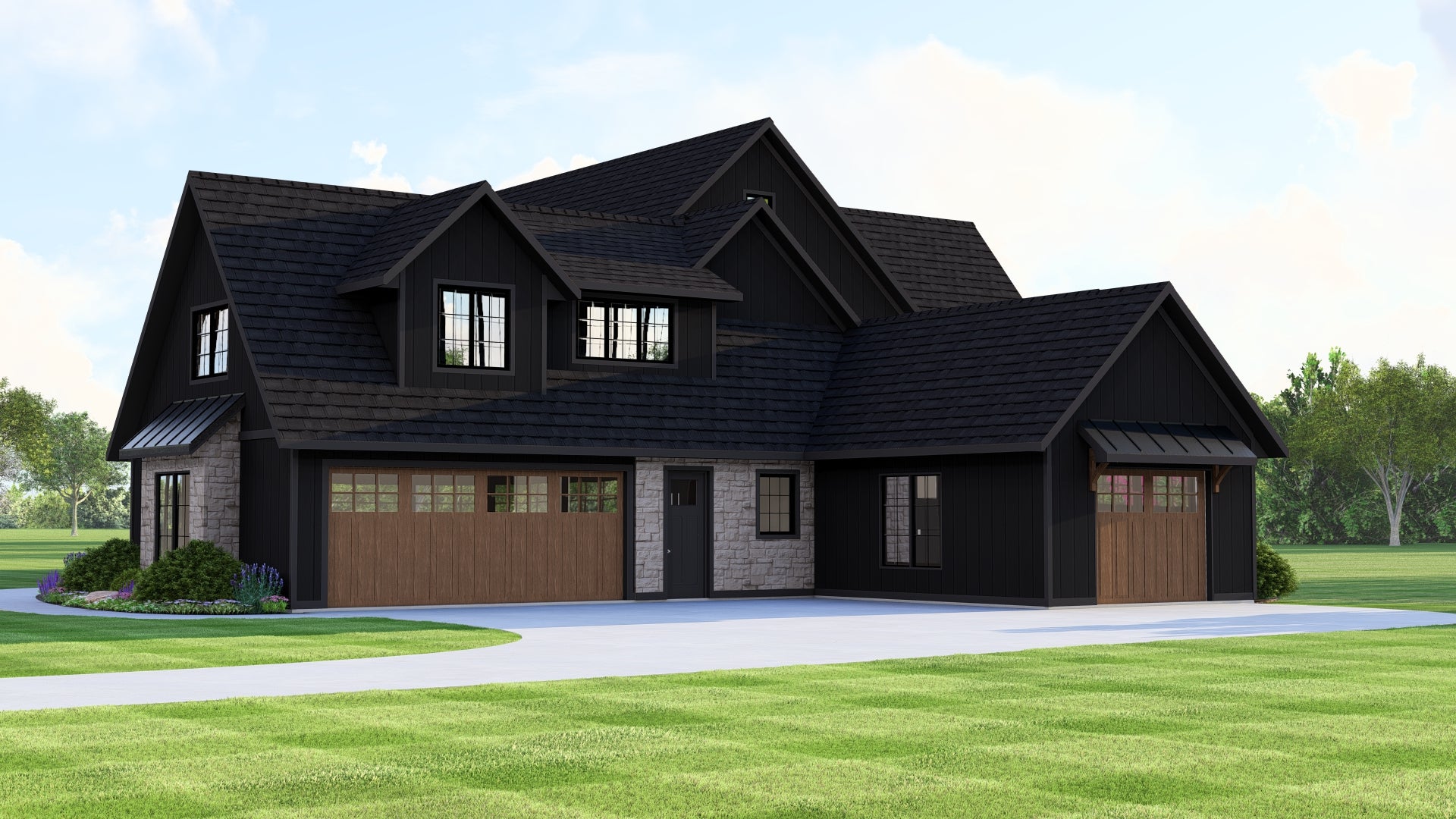 The exterior presents a commanding yet welcoming silhouette, defined by its steep 11:12 roof pitch, wide horizontal footprint, and clean structural lines. Deep covered front and rear porches create shaded outdoor living zones, extending the home’s usable space while reinforcing its timeless character. Built with 2x6 wall framing, the design supports energy efficiency, durability, and quiet interior comfort—an essential consideration for large homes designed to last generations.