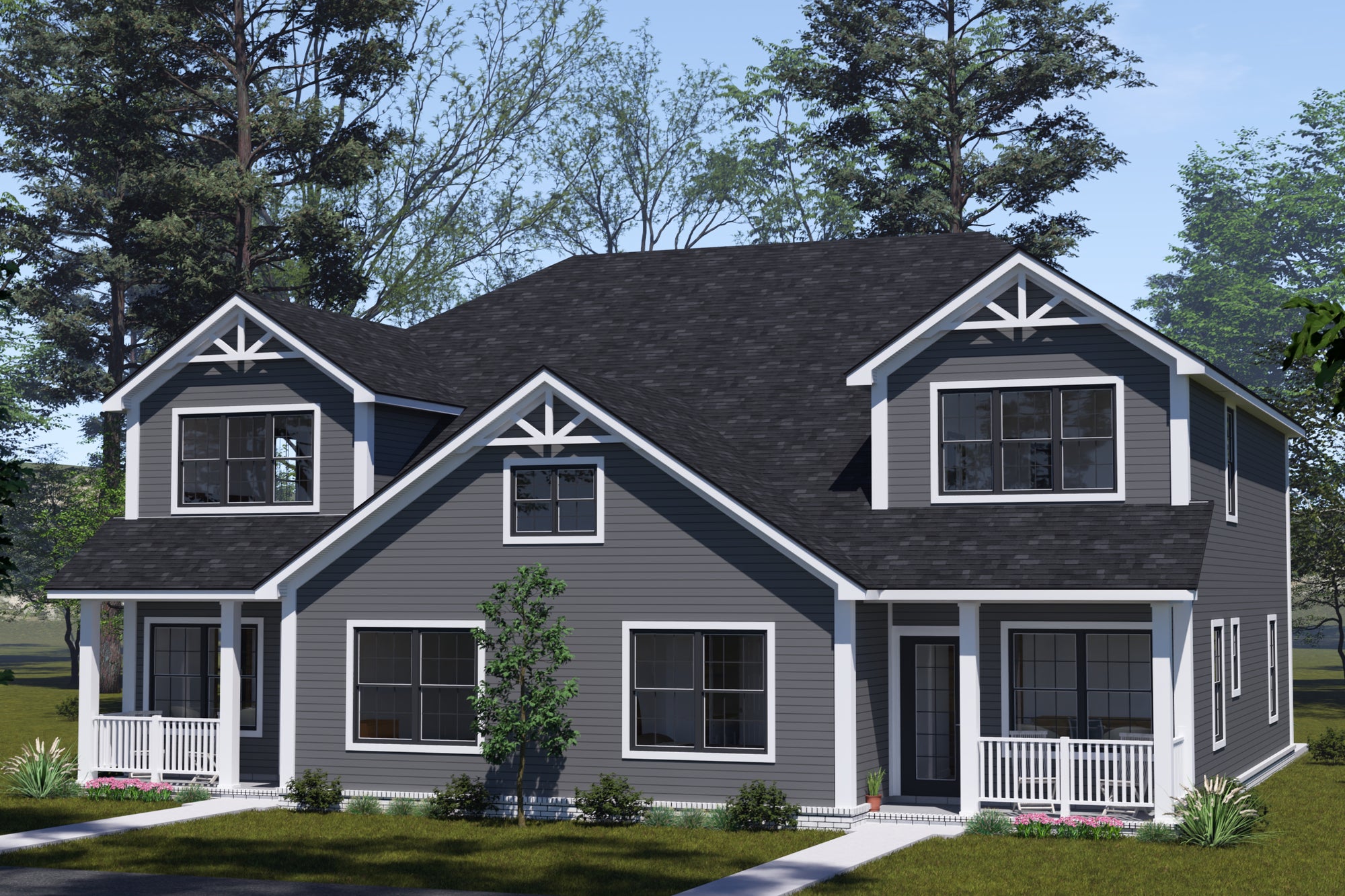 Designed with lifestyle and convenience in mind, both units feature kitchens with islands, home office/study spaces, second-floor laundry rooms, and walk-in closets throughout. The split-bedroom arrangement enhances privacy, while the covered front porch offers a welcoming curb appeal. Whether you're housing extended family or maximizing return on investment, this duplex is the perfect mix of modern design and smart living.