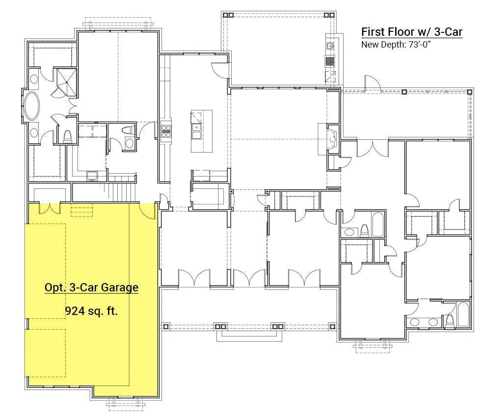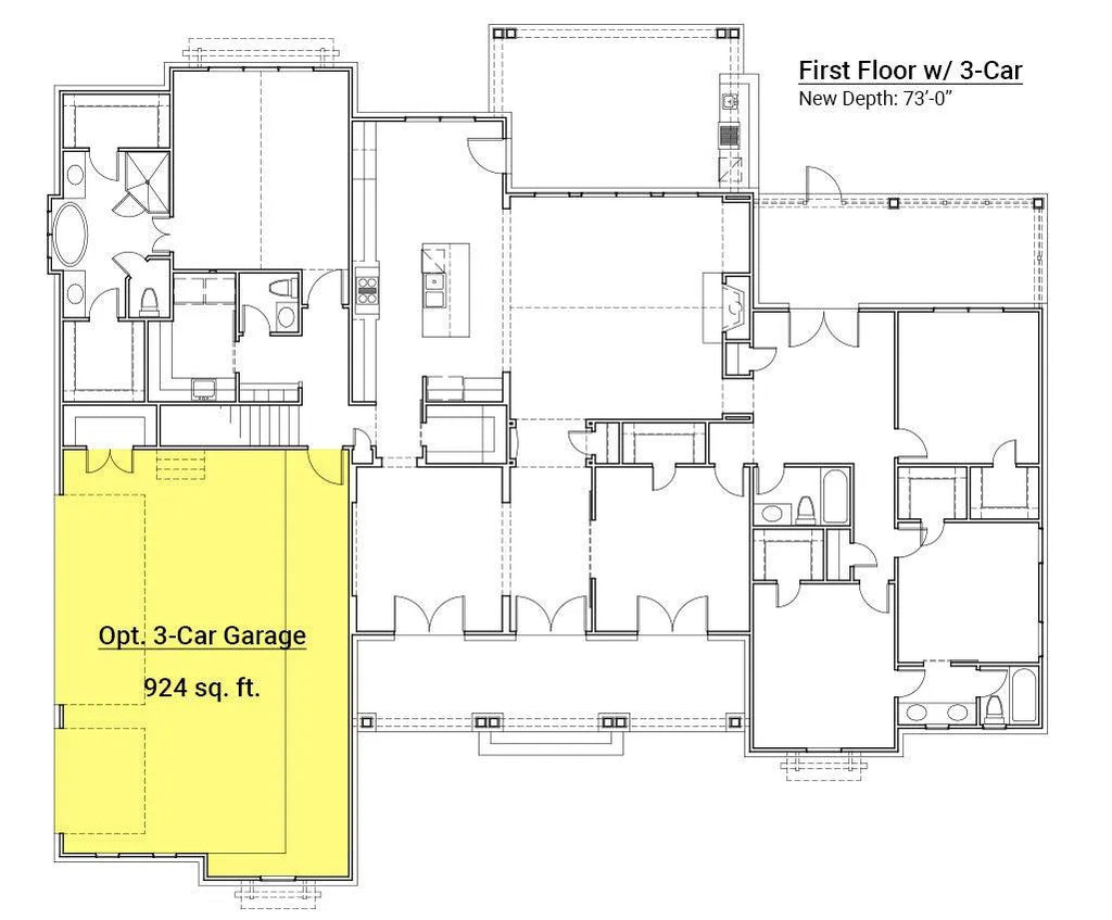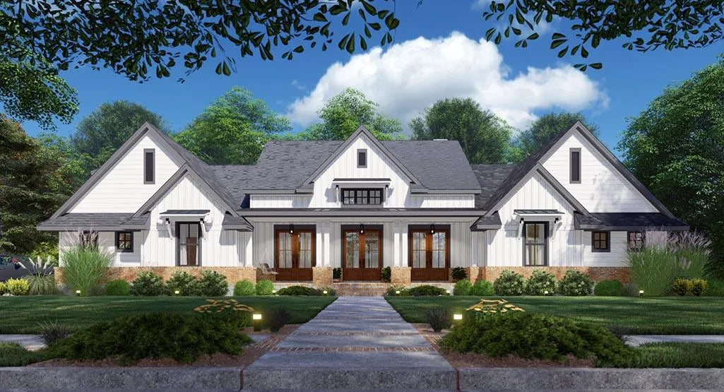 Creekview is a bright and inviting one-story house plan incorporating inspiration from many styles such as Craftsman, Ranch and Farmhouse. With gable style roofing, a covered front porch and a two-car garage accessible from the side, this welcoming home has a host of breathtaking features. Four bedrooms, three bathrooms and a half bathroom are included in 3077 sq. ft. of total living space.