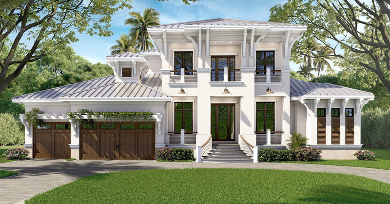 Elegant 5-Bedroom Coastal House Plan with Dual Balconies and Lanai