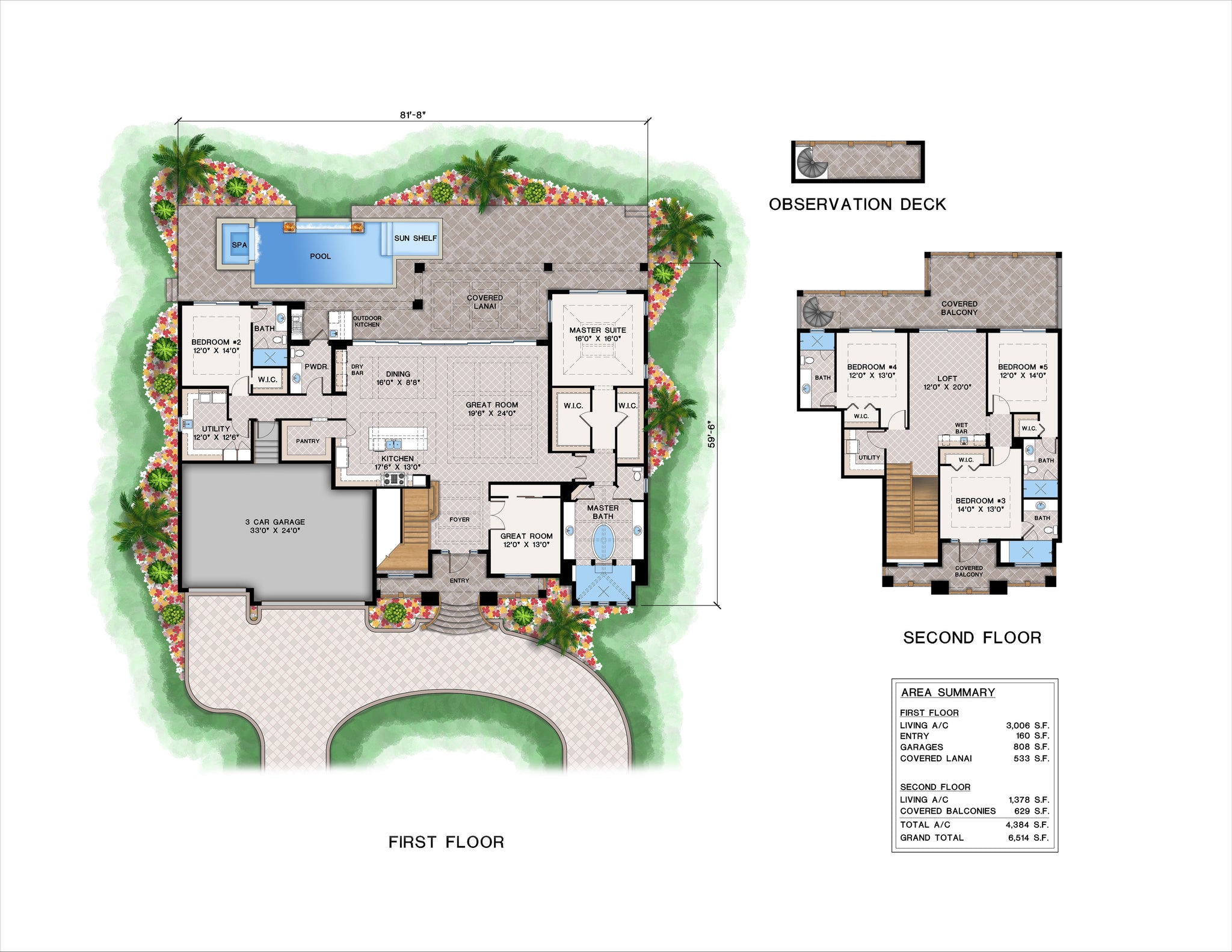 This luxurious 5-bedroom coastal-style home delivers impressive indoor–outdoor living with 4,384 sq ft of heated space. The main level emphasizes openness, flowing seamlessly from the grand foyer into a spacious great room and designer kitchen complete with an oversized island, eating bar, and walk-in pantry. A first-floor master suite provides convenience and privacy with its sitting area, double-vanity bath, and direct access to the lanai. The expansive outdoor living areas—including a 533 sq ft lanai and a 629 sq ft balcony—offer plenty of room for entertaining, dining, and relaxation.