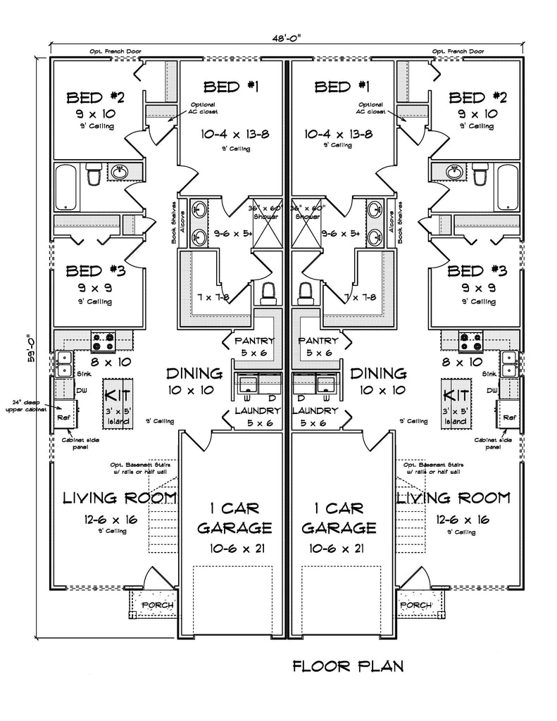 This modern duplex house plan combines comfort and efficiency in a smart, symmetrical layout. Each 1,120 sq ft unit offers an open-concept floor plan that connects the keeping room, breakfast area, and kitchen with a large island, ideal for relaxed living or entertaining.