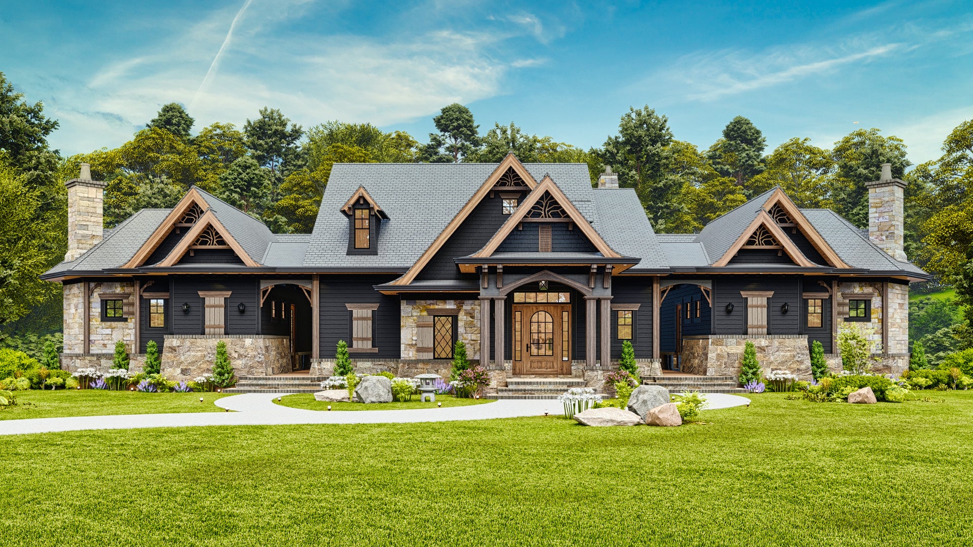 Designed as a serene mountain escape for couples or multigenerational living, this 2,684 sq ft rustic-style retreat blends privacy with spacious communal areas. At the heart of the home, a central open-concept living area connects the kitchen, great room, and dining space, flanked on either side by two private master suites — each with its own private sleeping porch. This layout ensures both togetherness and personal space, ideal for weekend getaways or full-time mountain living.
