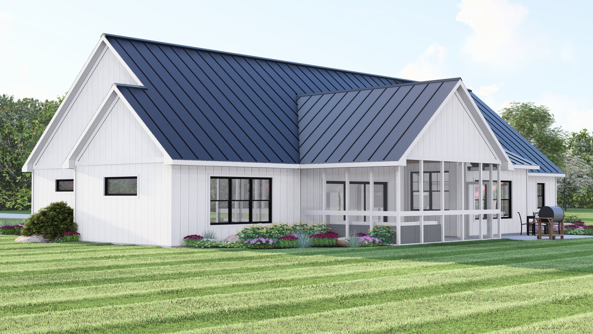 The private master suite is thoughtfully separated for comfort and privacy, featuring a spacious bath with double vanities, a walk-in closet, and convenient laundry access. Additional bedrooms are positioned for flexibility, while a home office, mudroom, and safe room add practical value. With generous storage, a well-sized garage, and smart flow throughout, this modern home plan delivers comfort, efficiency, and timeless appeal in one cohesive design.