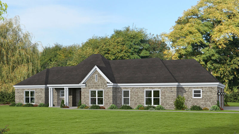This spacious 4-bedroom, 2-bath home offers 2317 sq ft of living space, all on the first floor, and includes a walkout basement for added convenience. The home features a beautiful stone exterior and a front-load 3-car garage (930 sq ft). The open floor plan includes a kitchen with an island and walk-in pantry, a breakfast area, and a game room. The first-floor master suite offers a double vanity, a sitting area, and a walk-in closet. Additional spaces include a home office/study, media room, and loft with a balcony. Enjoy outdoor living with a covered front porch (104 sq ft), rear porch (254 sq ft), and a screened porch/sunroom. Vaulted ceilings and ample storage make this home both functional and luxurious.