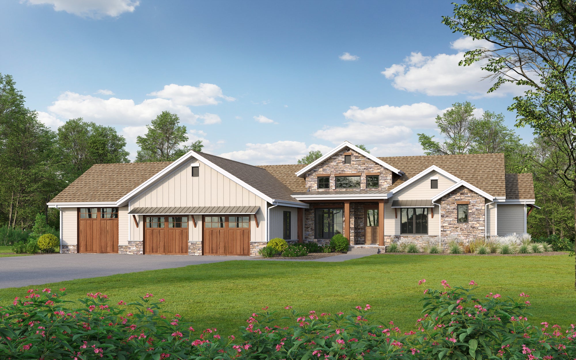 The side-entry 3-car garage (1,283 sq. ft.) provides ample parking and storage. With a 7:12 roof pitch and a building height of 23'3'', this home combines style, comfort, and functionality for modern living.