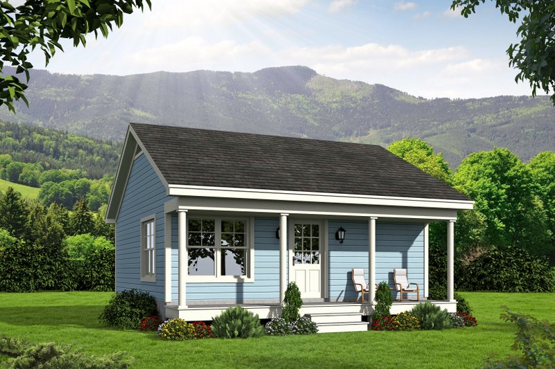 This efficient 561 sq ft home maximizes space and functionality, featuring a first-floor master suite with a walk-in closet. The open floor plan connects the living, kitchen, and dining areas, creating a spacious feel despite the compact design. A first-floor laundry adds convenience, while the covered front porch provides a welcoming outdoor space. With a crawl space foundation, 2x4 wall framing, and a roof pitch of 6:12, this home combines practicality with simple, stylish living in a compact footprint. Ideal for those seeking a cozy and functional living space.