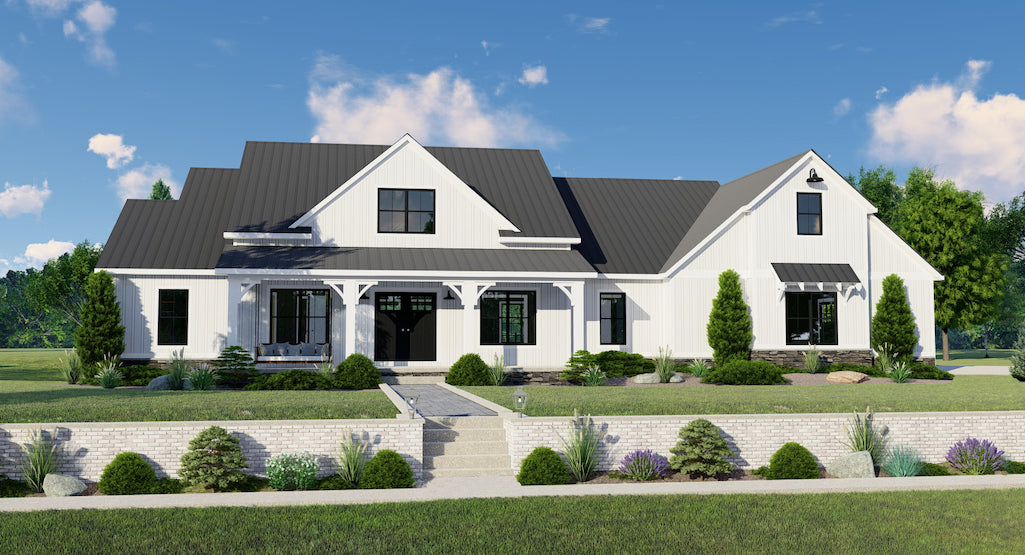 Practical features like a first-floor laundry with direct access from the master suite, a mudroom for daily organization, and a wet bar contribute to the home's livability. A bonus room over the garage adds 586 sq ft of flexible space for a home office, hobby room, or playroom. The walkout basement provides potential for additional living or entertainment space, ideal for a future game room or guest quarters. With a side-loading 2-car garage, truss roof framing, and 2x6 wall framing for energy efficiency, this plan combines elegant design with modern functionality for families or retirees alike.