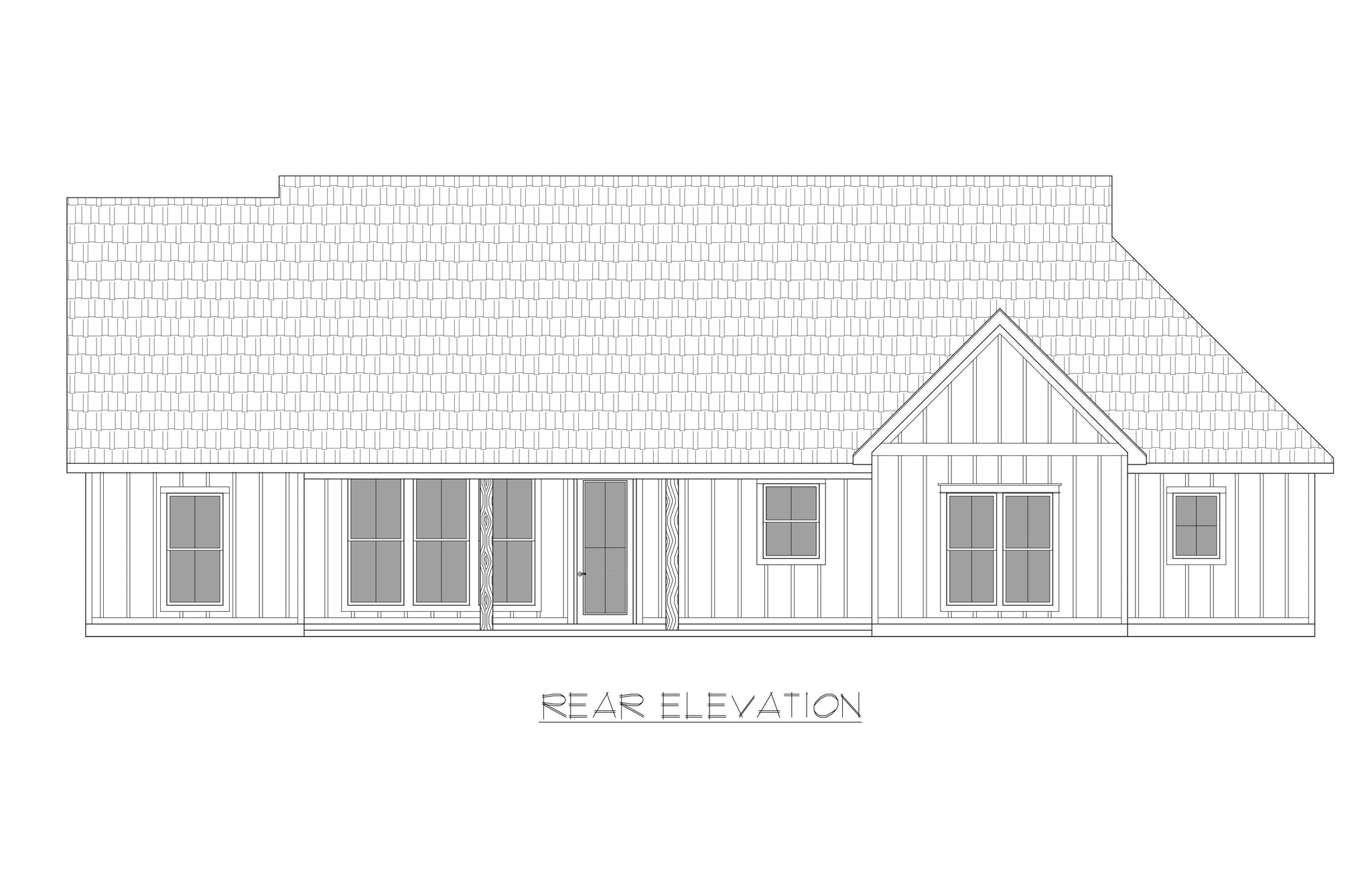 • Elevations: Front and rear views with door/window placements, roof pitches, and exterior features.