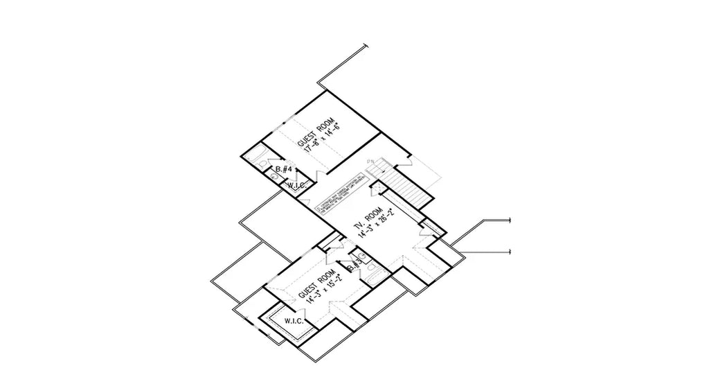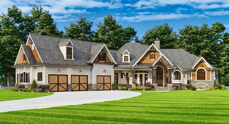 An inviting exterior combines stone, shake, and timber accents to create impressive curb appeal. As you enter this home a truss-accented lodge room is crafted with a fireplace and built in cabinetry. At the heart of this home, conversations freely flow from the center island kitchen to the keeping room and breakfast area. Enjoy the outdoors and breathtaking views from either the open deck or the covered porch. A luxurious master suite, in-laws suite, and a three car garage round out the first floor. Two guest rooms with private bathrooms and a T.V. room comprise the second floor of this master downhouse plan.