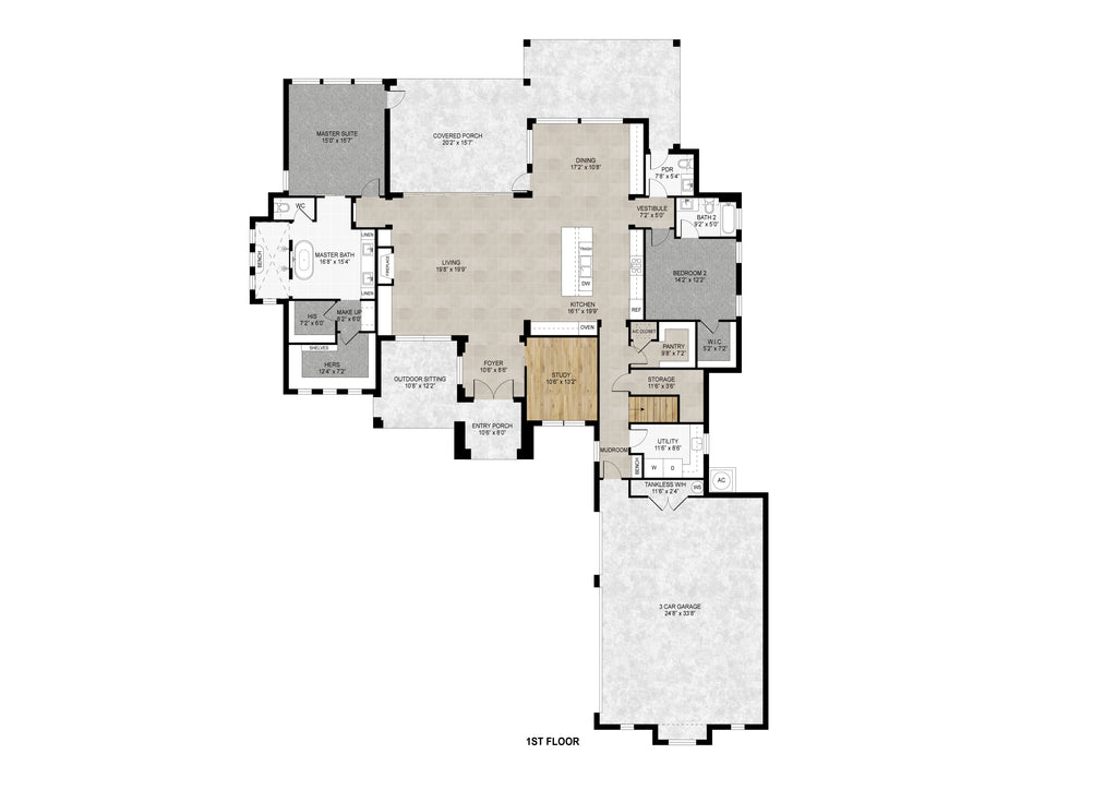 This 3,452 sq. ft. contemporary home blends luxurious living with thoughtful functionality across two well-planned stories. The expansive 2,596 sq. ft. first floor features an open-concept layout anchored by a dramatic two-story grand room that flows seamlessly into the dining and kitchen areas. A spacious walk-in pantry and mud room add everyday convenience, while the kitchen’s layout is perfect for entertaining. The first-floor master suite is a private retreat with a luxurious bath and large walk-in closet, thoughtfully separated from the secondary bedrooms for enhanced privacy.