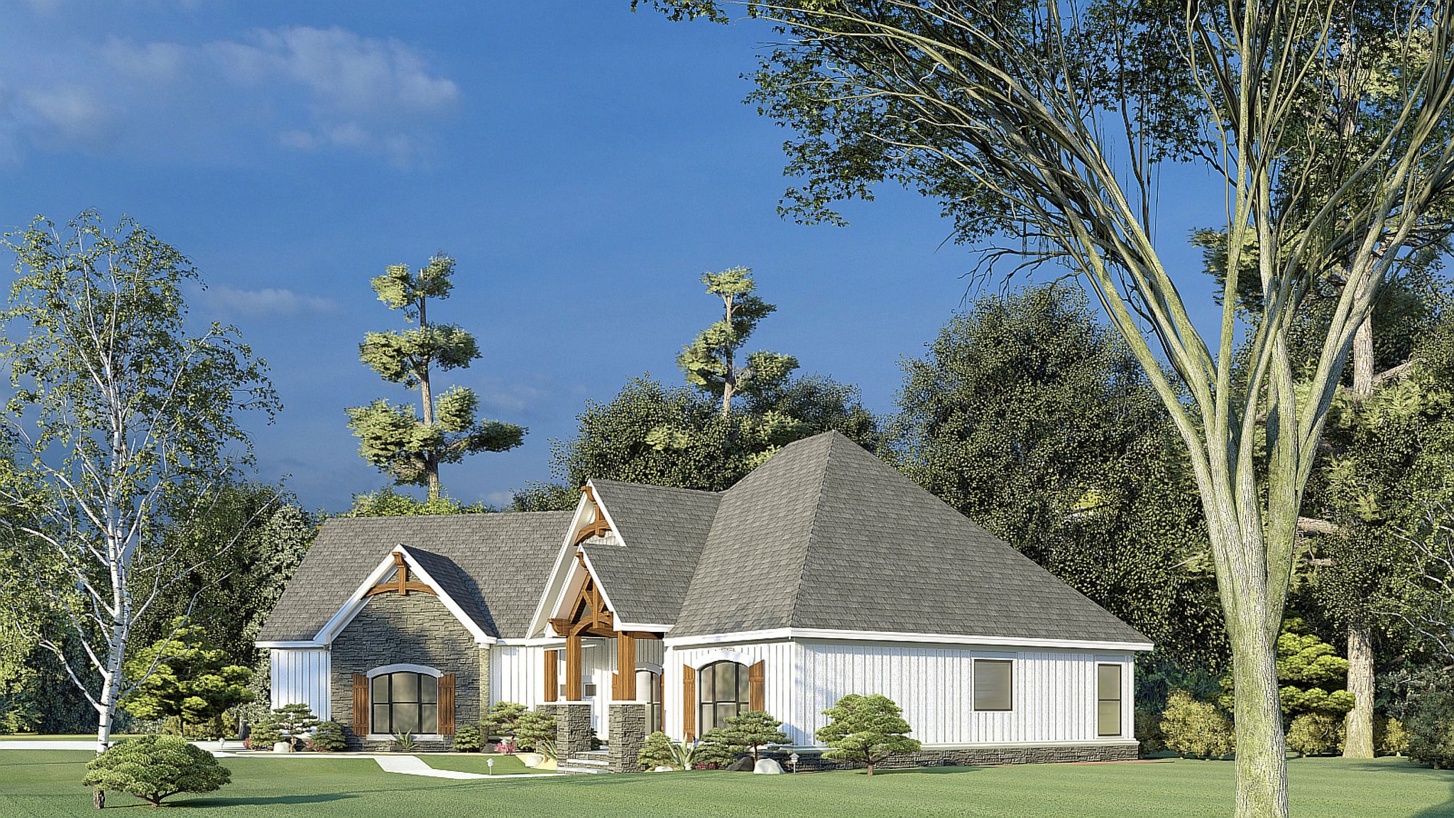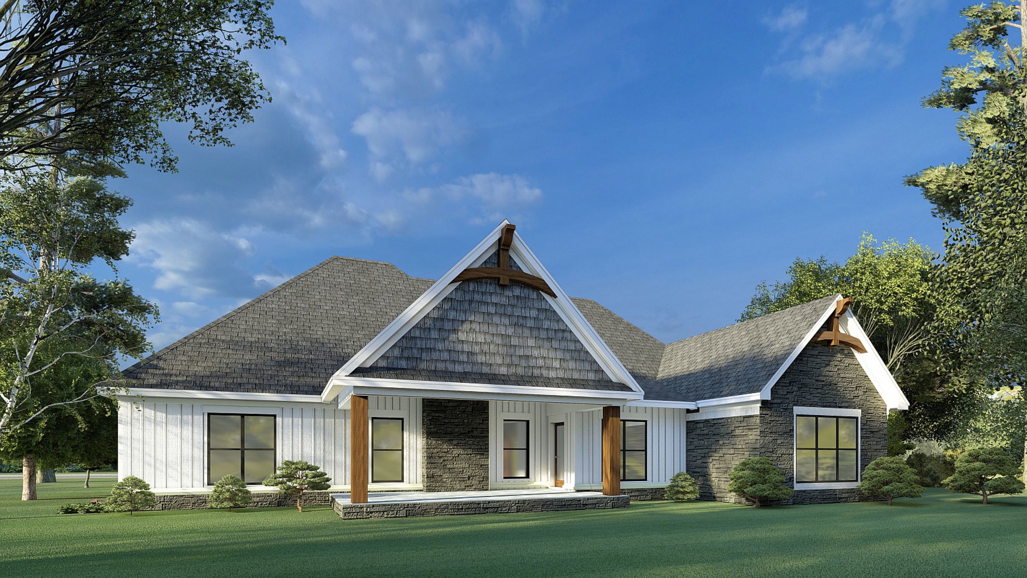 Craftsman-style charm shines through with a front-load angled garage, covered front and rear porches, and classic roof lines with a 12:12 pitch. With 2x4 wall framing, slab or crawl foundation options, and 9-foot ceilings on the main level, this home combines timeless appeal with modern comfort. A Jack and Jill bath connects the secondary bedrooms, making it ideal for families, and the bonus room adds flexibility for future needs. This plan delivers elegance, efficiency, and plenty of space to grow—all wrapped in a smart and stylish design.