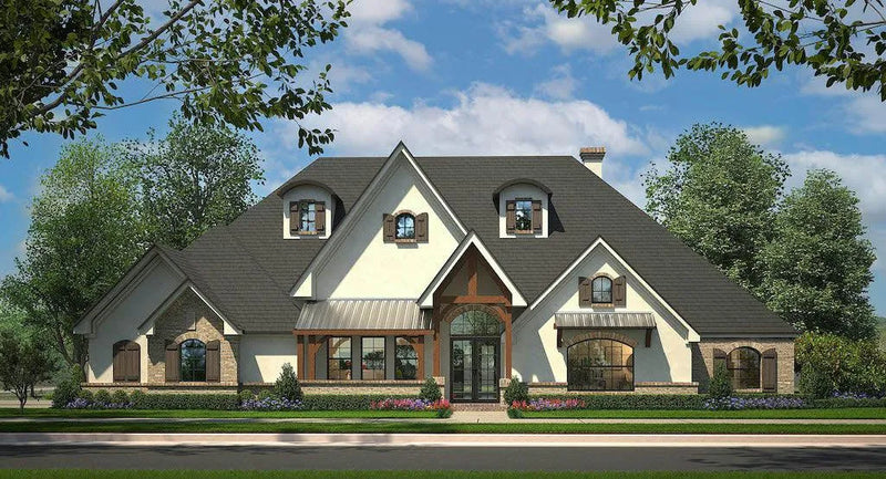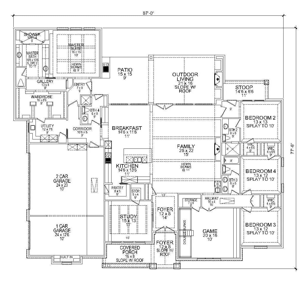This stunning home plan offers a generous total living area of 3,553 sq ft, all situated on the first floor for convenience. With four well-appointed bedrooms and four bathrooms, it provides ample space for family living and entertaining. The side-load garage, measuring 889 sq ft and accommodating three vehicles, ensures easy access and practicality. Built on a sturdy slab foundation, the house features 2x4 wall framing and stands at an impressive height of 33 feet, enhancing its presence. The home measures 87 feet wide by 78 feet deep, with a first-floor ceiling height of 10 feet, creating an open and airy atmosphere that is perfect for convenient lifestyles.