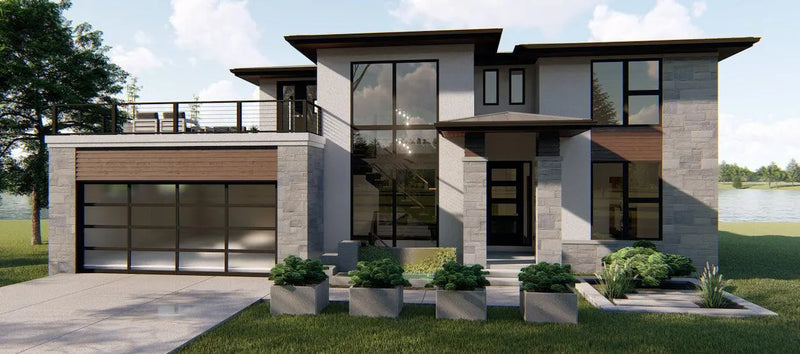 • This 4-bed house plan has a beautiful modern style with classic prairie elements. The exterior combines wood and stone with large modern windows to give this house tons of curb appeal.