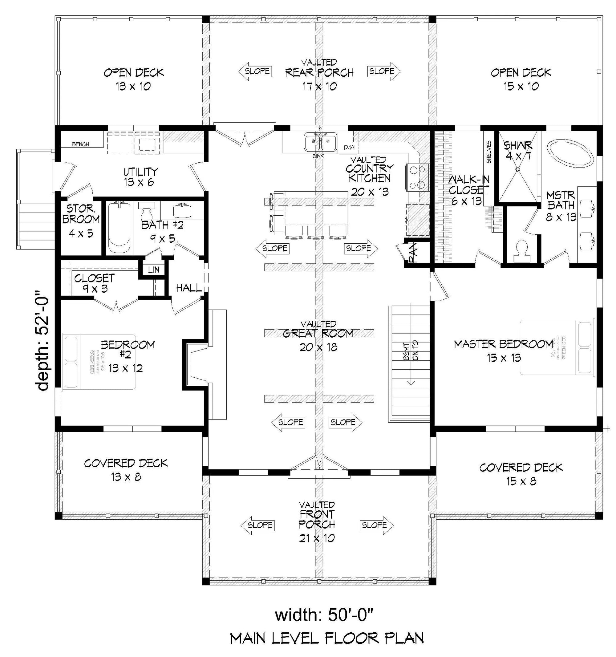 • Vaulted porches adorn both the front and back of this 2-bed house plan making it equally attractive whether you're greeting from the street or from the lake. A pair of french doors open to reveal a dramatic vaulted interior and a floor plan open front to back.
