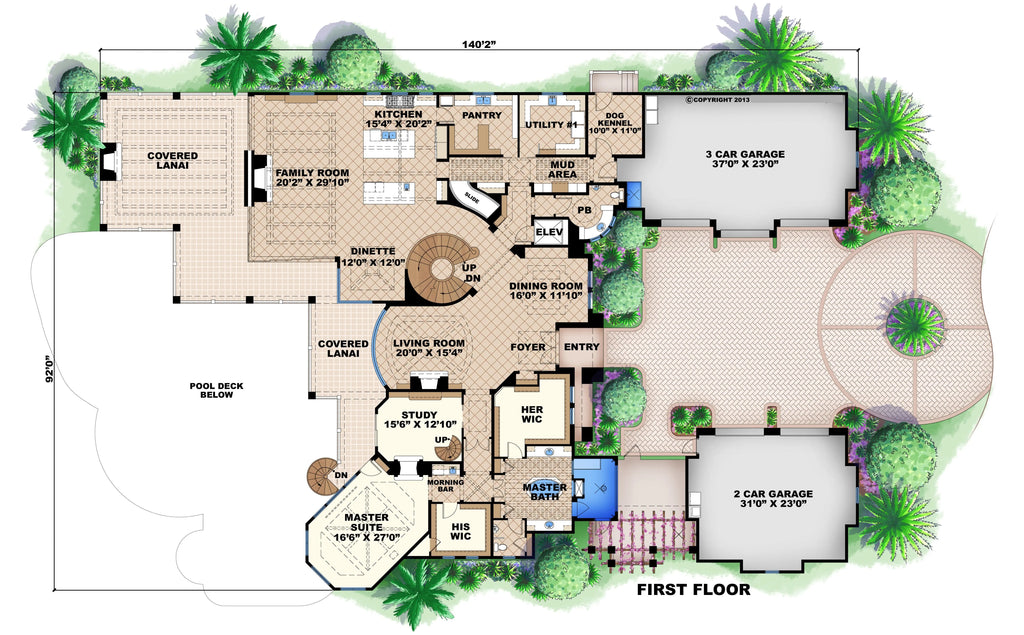 The Isla Del Rey house plan offers 16,783 square feet with six bedrooms including a master and junior master suite. The floor plan also includes a study, formal living and dining rooms, a large gourmet kitchen with double islands and a baking kitchen/walk-in pantry, a theatre, craft room, game room, exercise room, three separate playrooms and even an indoor slide. This Tuscan house plan also has numerous covered balconies, an elaborate outdoor living area, and a 5-car garage. If you are in search of the perfect family dream home, then look no further than this waterfront mansion.
