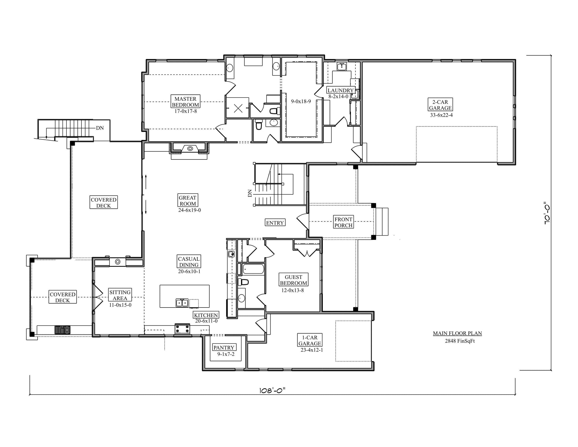 A glamorous spacious house plan that offers a total heated living area of 2,848 square feet, all situated on the first floor. The layout includes a generous walkout basement measuring 1,536 square feet, providing additional living space and accessibility to the outdoors. A stunning deck of 1,654 square feet enhances outdoor living, perfect for entertaining or relaxation. The garage, with a size of 1,120 square feet, features three bays and is front-loaded for easy access. Inside, the home includes two bedrooms, two full bathrooms, and one half bathroom, accommodating residents and guests comfortably. Built with a sturdy 2x6 wall framing, the house measures 70 feet in width and 108 feet in depth, reaching a height of 24 feet 6 inches. Both the first floor and basement boast ceiling heights of 10 feet, creating an open and inviting atmosphere throughout the home.