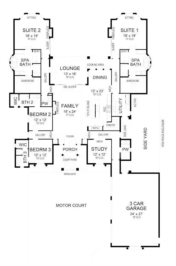 This impressive home boasts a total living area of 3,460 sq ft, all located on the first floor. With a total area under the roof of 4,962 sq ft, this plan offers ample space for comfortable living. The garage spans 922 sq ft and features three bays, providing generous parking options with a courtyard load. The house includes four bedrooms, four full bathrooms, and two half bathrooms, making it ideal for families or entertaining guests. Constructed on a sturdy slab foundation with 2x4 wall framing, the house measures 78 feet in width and 121 feet in depth. The building height reaches 22 feet, complemented by an impressive first-floor ceiling height of 11 feet, creating an open and airy atmosphere throughout.