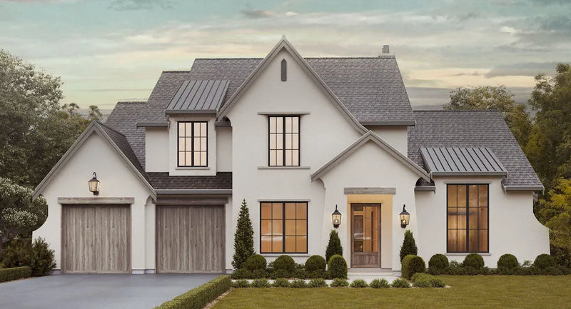 • Exterior Elevations – Front, rear, and side views detailing exterior finishes and rooflines