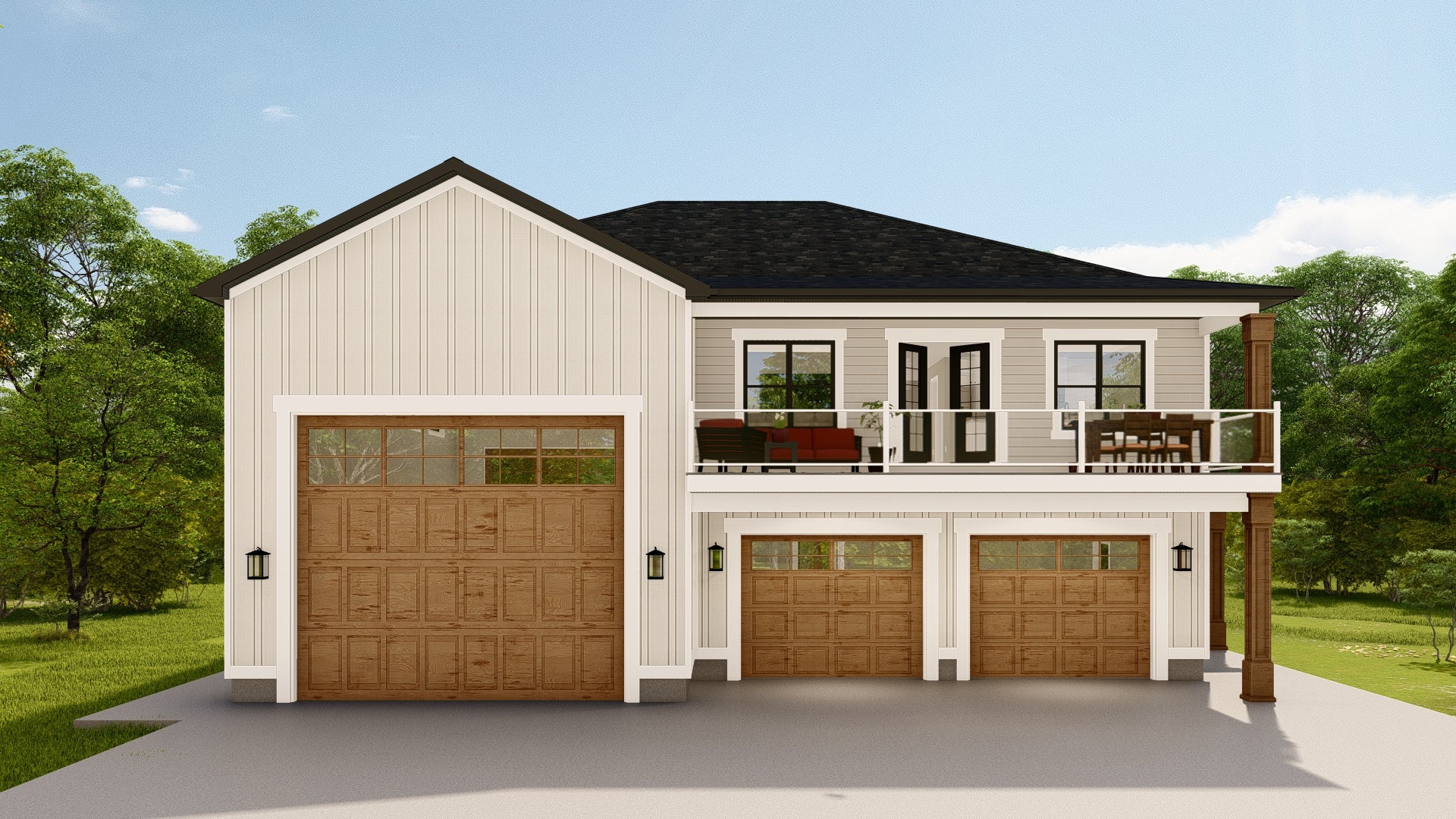 This versatile garage apartment plan offers the perfect combination of style, function, and modern living. With 1,218 sq ft of heated space, the layout includes a 251 sq ft first floor entry and a spacious 967 sq ft second floor residence. The three-car rear-load garage provides abundant storage and parking, while the slab foundation and 2x6 framing ensure lasting durability.