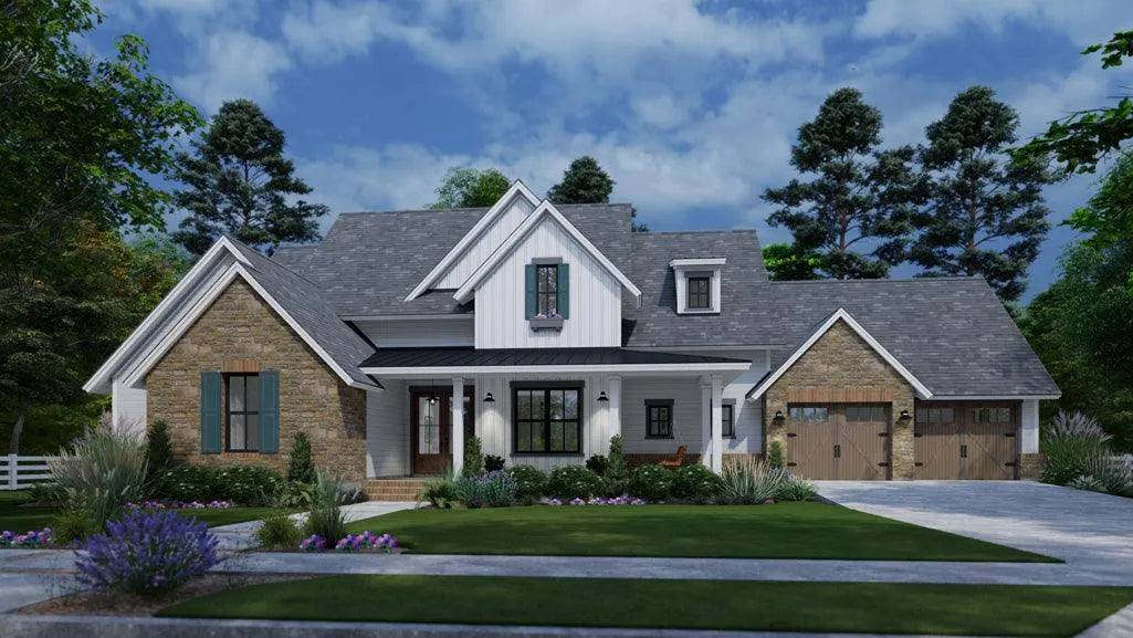 Enjoy outdoor relaxation with a front porch that spans 273 sq ft and a rear porch that offers 645 sq ft, providing ample space for gatherings or quiet evenings outdoors. The front-loading garage (622 sq ft) accommodates two vehicles and offers additional storage solutions.
