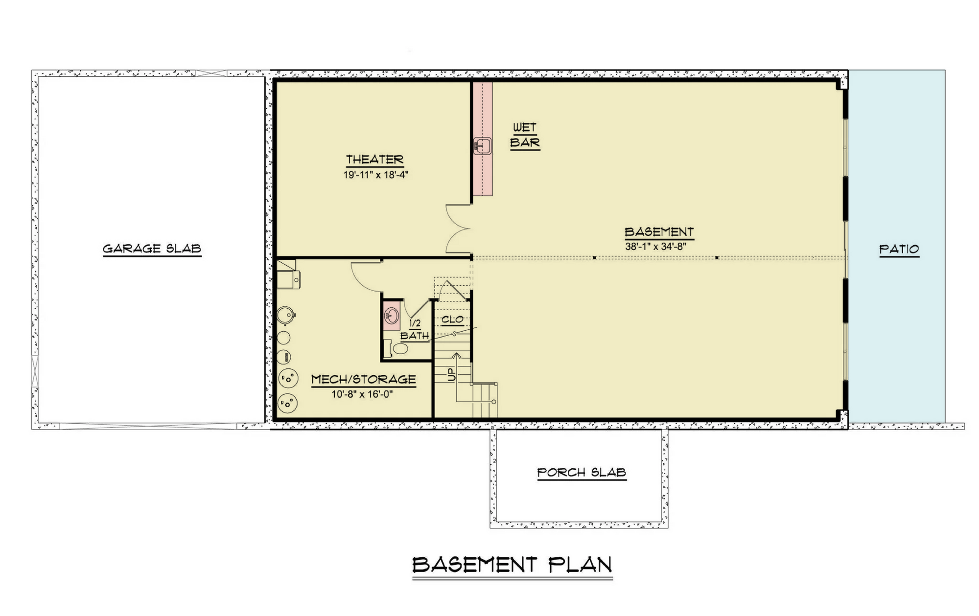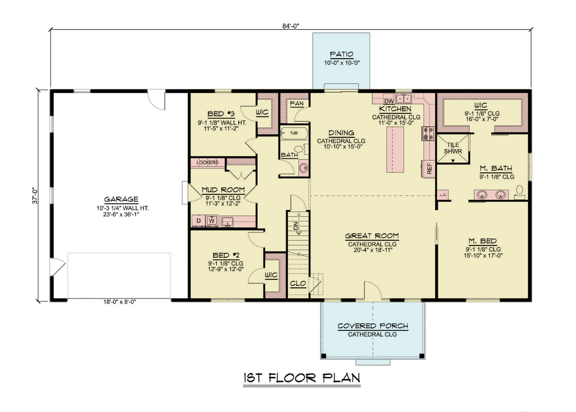 This house plan features a total heated living area of 2,220 square feet, all located on the first floor, complemented by an unfinished basement of 2,169 square feet that offers potential for future development. The total porch area measures 177 square feet, providing an inviting outdoor space. The garage, with a size of 888 square feet, includes two bays and is front-loaded for easy access. Inside, the home boasts three bedrooms, two full bathrooms, and one half bathroom, ensuring ample facilities for residents and guests. Built on a walkout basement foundation, the structure utilizes 2x6 wall framing for durability and insulation. With a width of 84 feet and a depth of 37 feet, this home stands at a height of 18 feet 10 inches, featuring a first-floor ceiling height of 9 feet and a similarly spacious basement ceiling height.