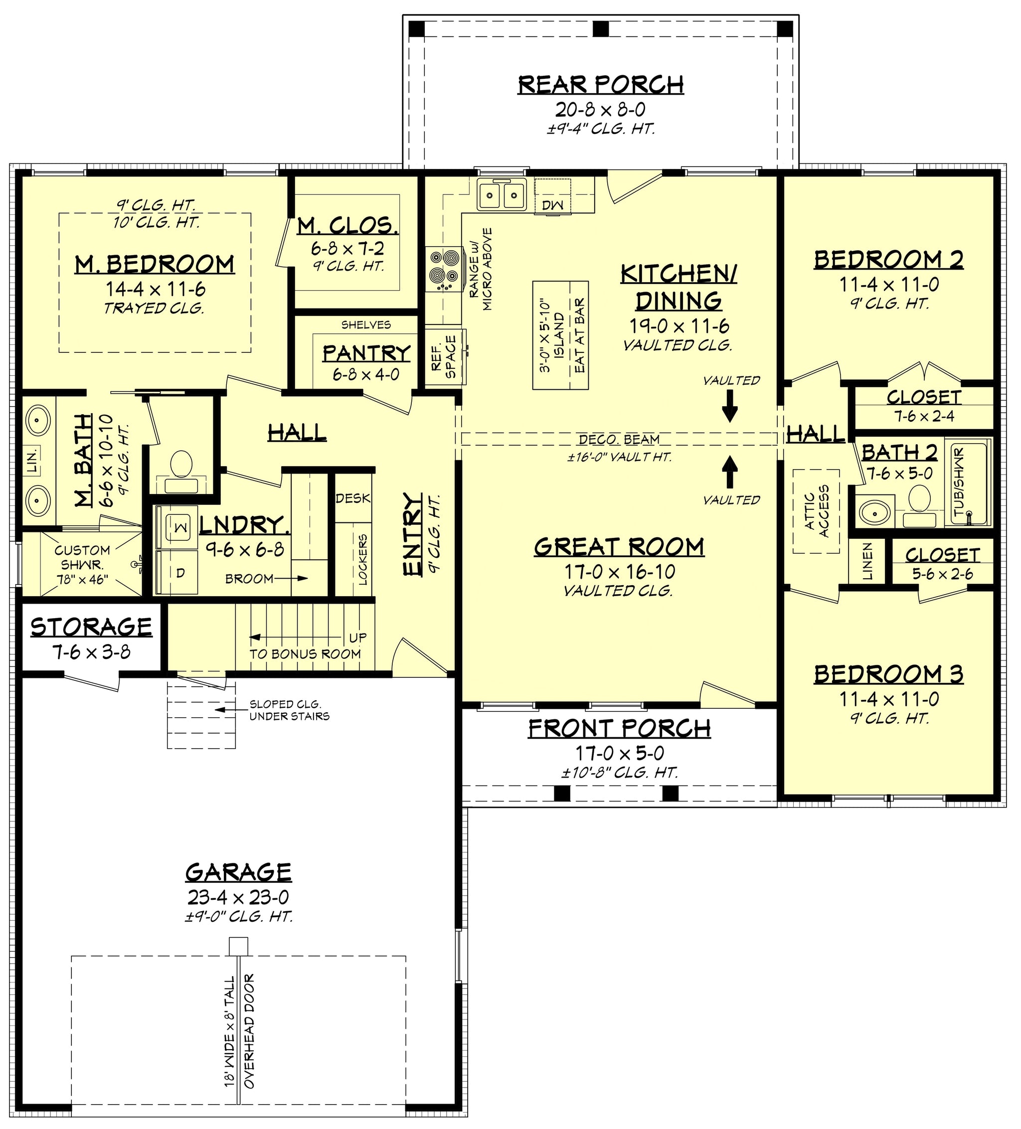 This country modern farmhouse plan blends rustic charm with fresh, modern design. With 1,526 sq. ft. of heated living space, this one-story home features an open floor plan that connects the great room, kitchen, and breakfast area—perfect for family gatherings and entertaining. The kitchen island, walk-in pantry, and vaulted ceilings enhance the sense of spaciousness and function.