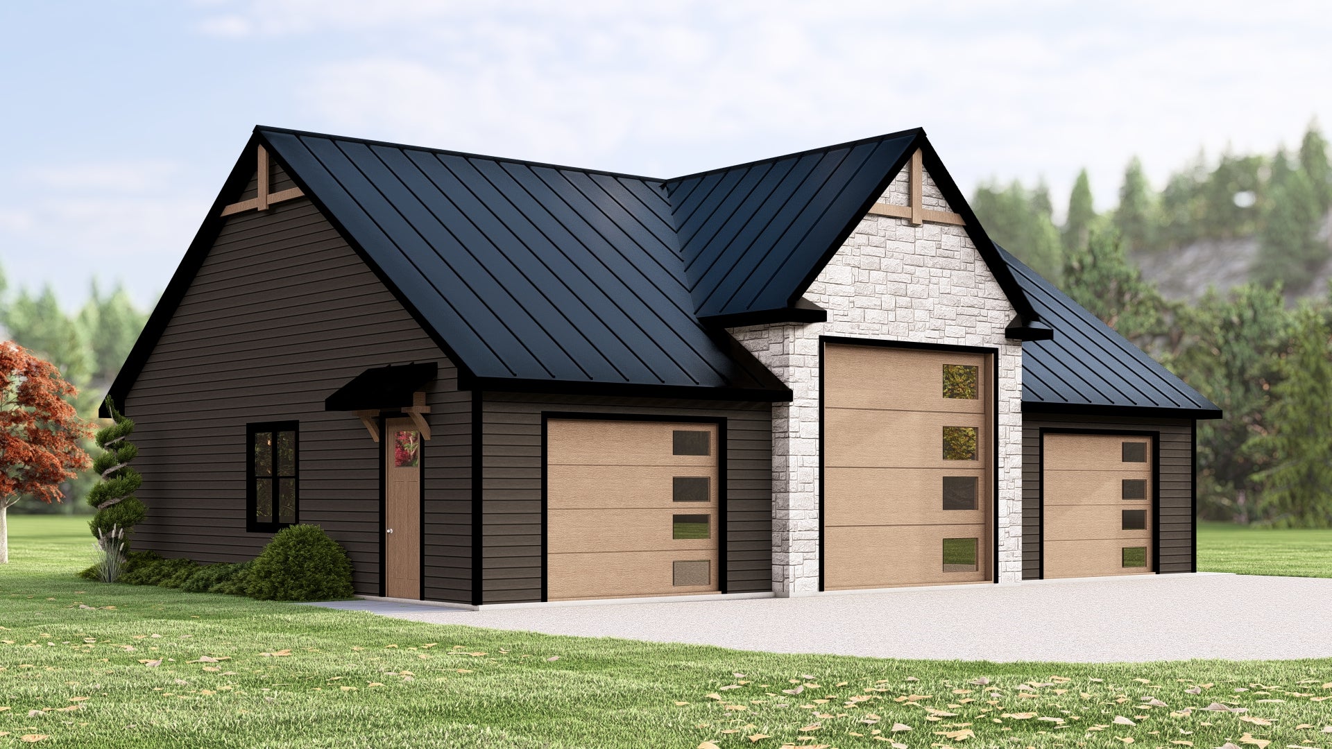 This 1,866 sq ft garage offers ample space for three vehicles, with a front-loading configuration. The garage is built with a durable slab foundation and features 2x4 wall framing for strength and stability. The roof is framed with trusses, offering an 8:12 and 12:12 pitch for an attractive, functional design. The building height reaches 22' 11", providing plenty of headroom and vertical storage space. The garage is designed to seamlessly complement the main house, with a width of 50 feet and a depth of 38 feet, offering easy access and spacious storage options.