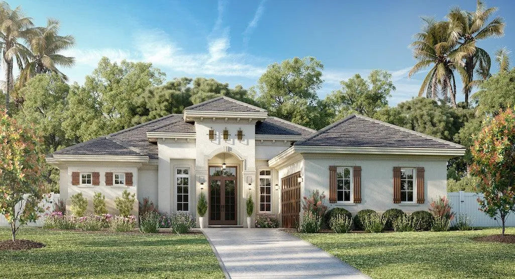 This 3-bedroom, 3-bath Florida-style home offers 2,397 sq. ft. of luxurious single-level living, blending open-concept design with elegant details for modern family life. The stucco exterior and side-entry two-car garage create refined curb appeal, while the covered front porch welcomes guests with warmth and style. Inside, a spacious great room flows seamlessly into the kitchen and dining areas, highlighted by a large island, wet bar, and eating bar — perfect for entertaining or relaxed family gatherings.