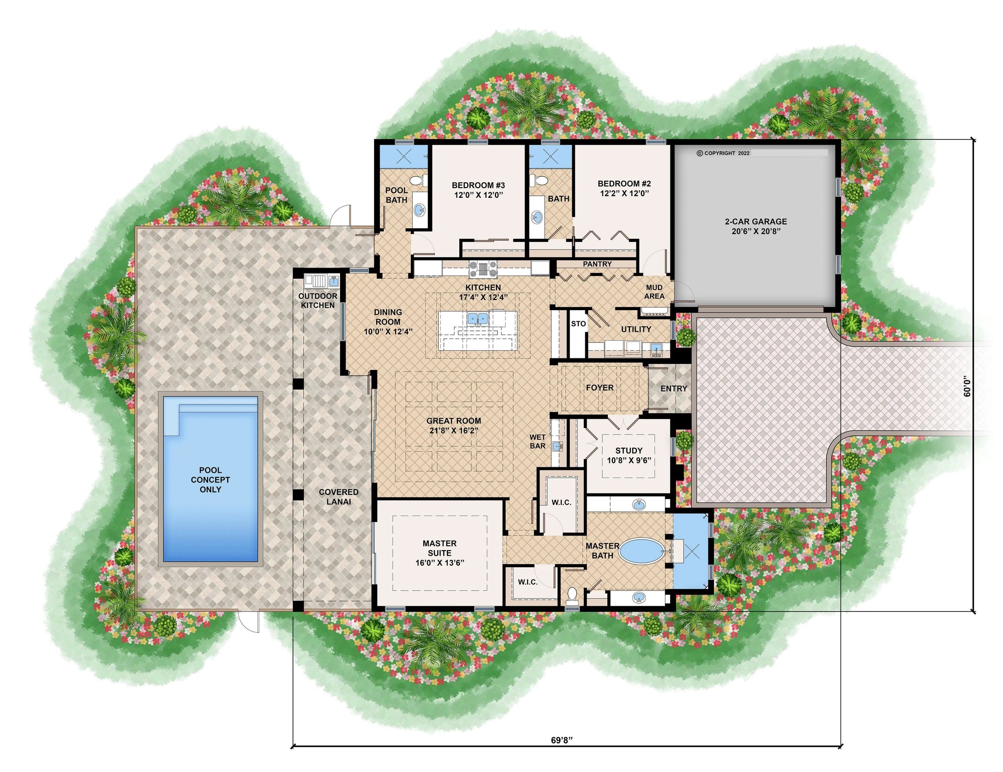 The thoughtful split-bedroom layout ensures privacy, with the first-floor master suite featuring his and hers walk-in closets, a double-vanity bath, and a view of the backyard. The home also includes a home office/study, mudroom, and first-floor laundry for everyday convenience. Outdoor living is a centerpiece of this design, boasting a 382 sq. ft. lanai with space for an outdoor kitchen — ideal for year-round enjoyment. Built on a slab foundation with durable CMU wall framing and a 6:12 truss roof, this 60' x 69'8" home beautifully combines comfort, functionality, and timeless Florida elegance.