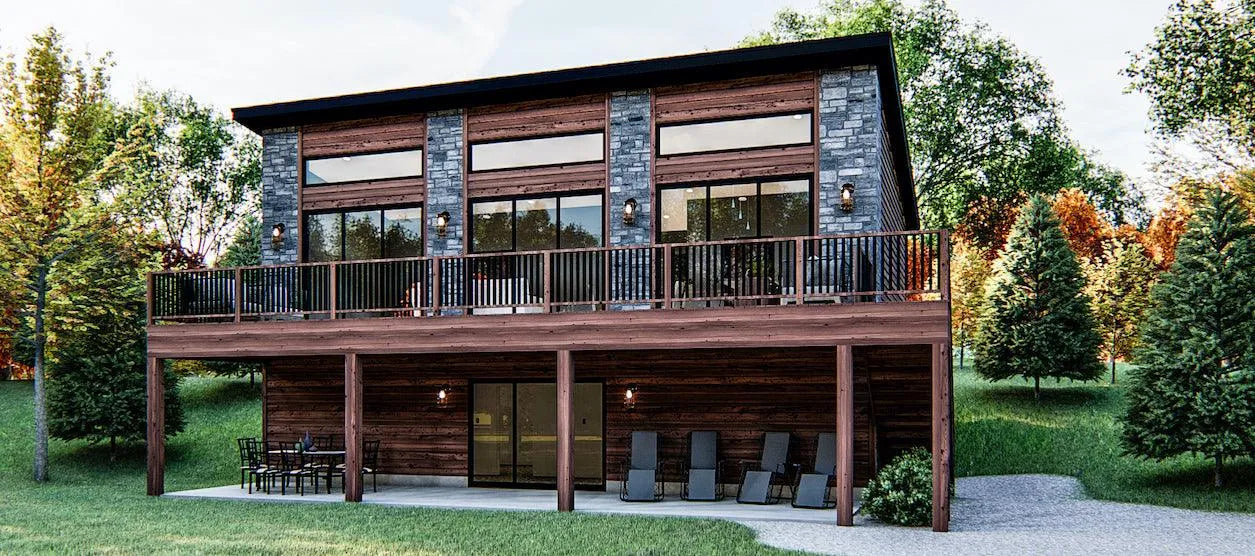 The Balenger plan is a fantastic modern cabin that is the ultimate weekend getaway home. The exterior blends stone with wood to give this home a modern mountain curb appeal. The interior of the home has all of the amenities of a much larger home, including a full kitchen with an island and a large walk-in pantry. The main level lies under a sloped roof and allows an abundance of natural light in through its 3 large sliding glass doors and transom windows. The sliding doors lead out to a massive deck that maximizes your outdoor enjoyment.